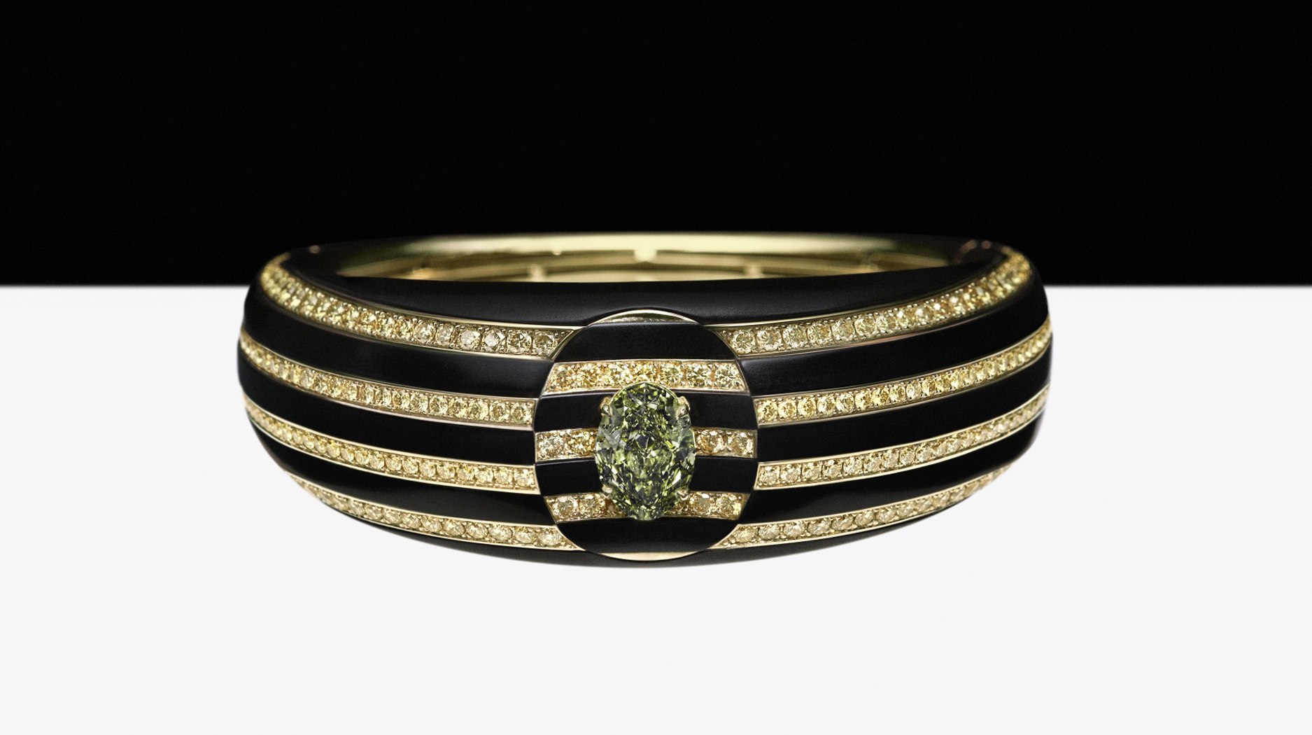 A bangle alternates rows of yellow round brilliant pavé-set diamonds with black aluminum, a 3.02-carat fancy deep grayish green oval-shaped diamond at the center.