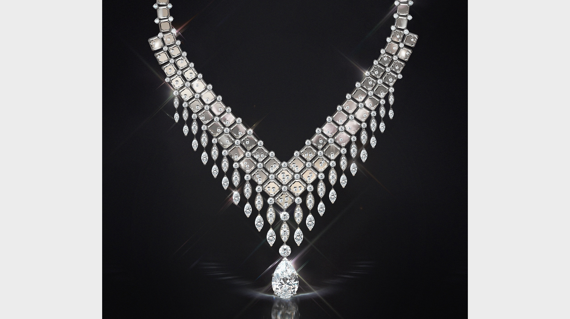 The “Frozen Capture” necklace features a total 46.66 carats of diamonds, including a 20.1-carat pear-shaped diamond drop.