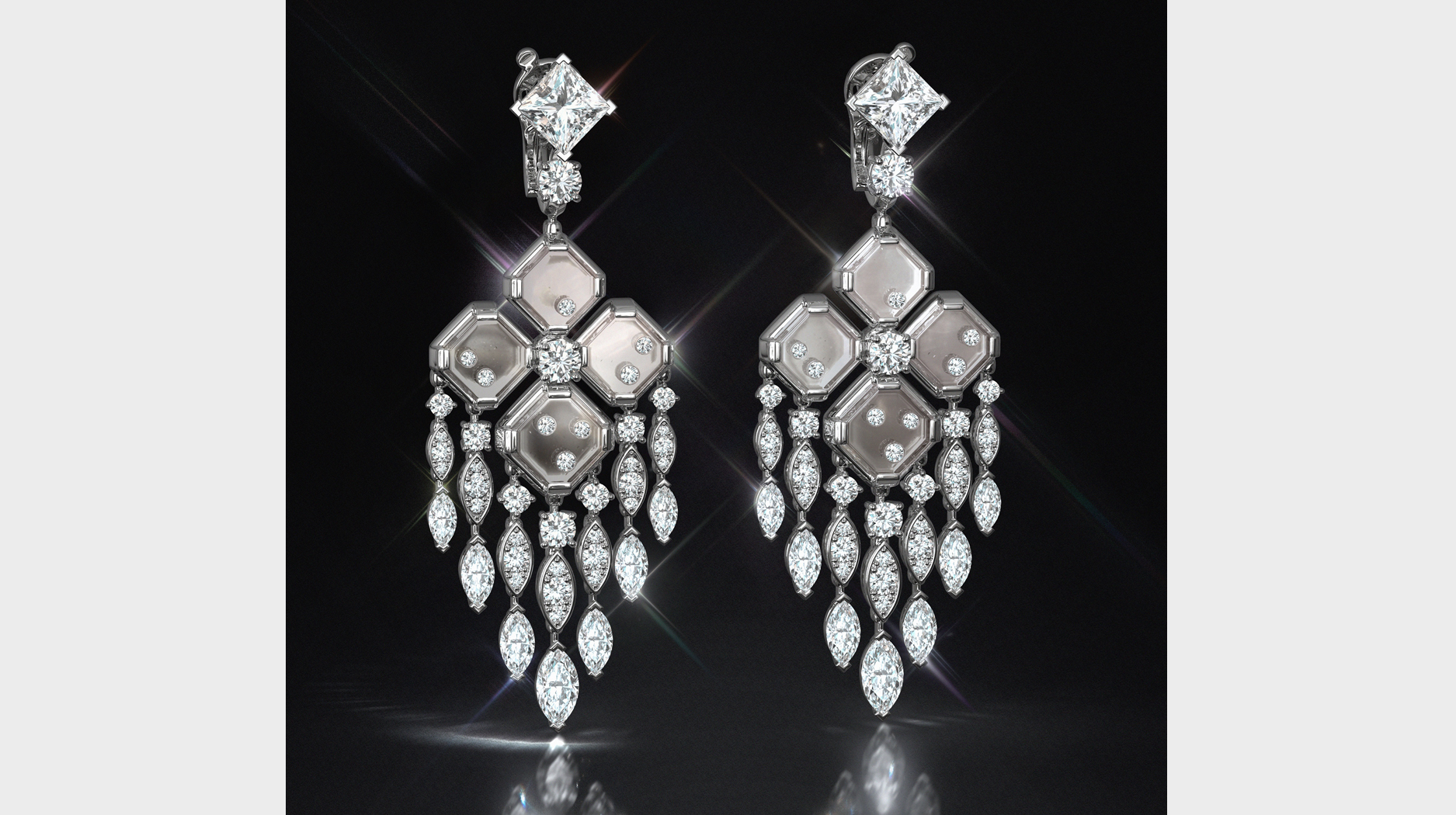 A bracelet, earrings, and ear cuff and stud earring, all featuring diamonds and rock crystal squares, complete the assortment.
