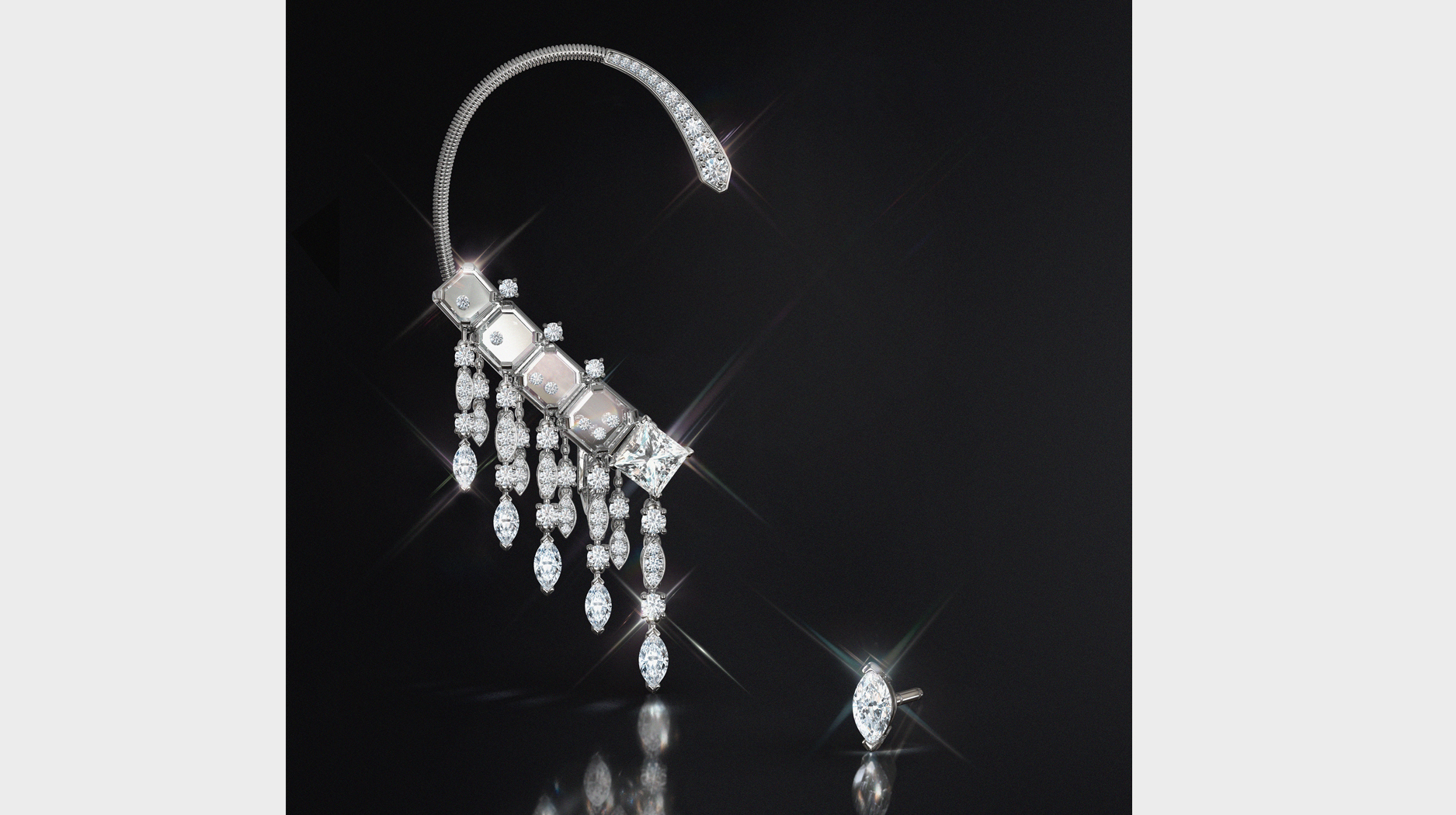 An ear cuff with a marquise-shaped diamond stud has a total 4.47 carats of diamonds.