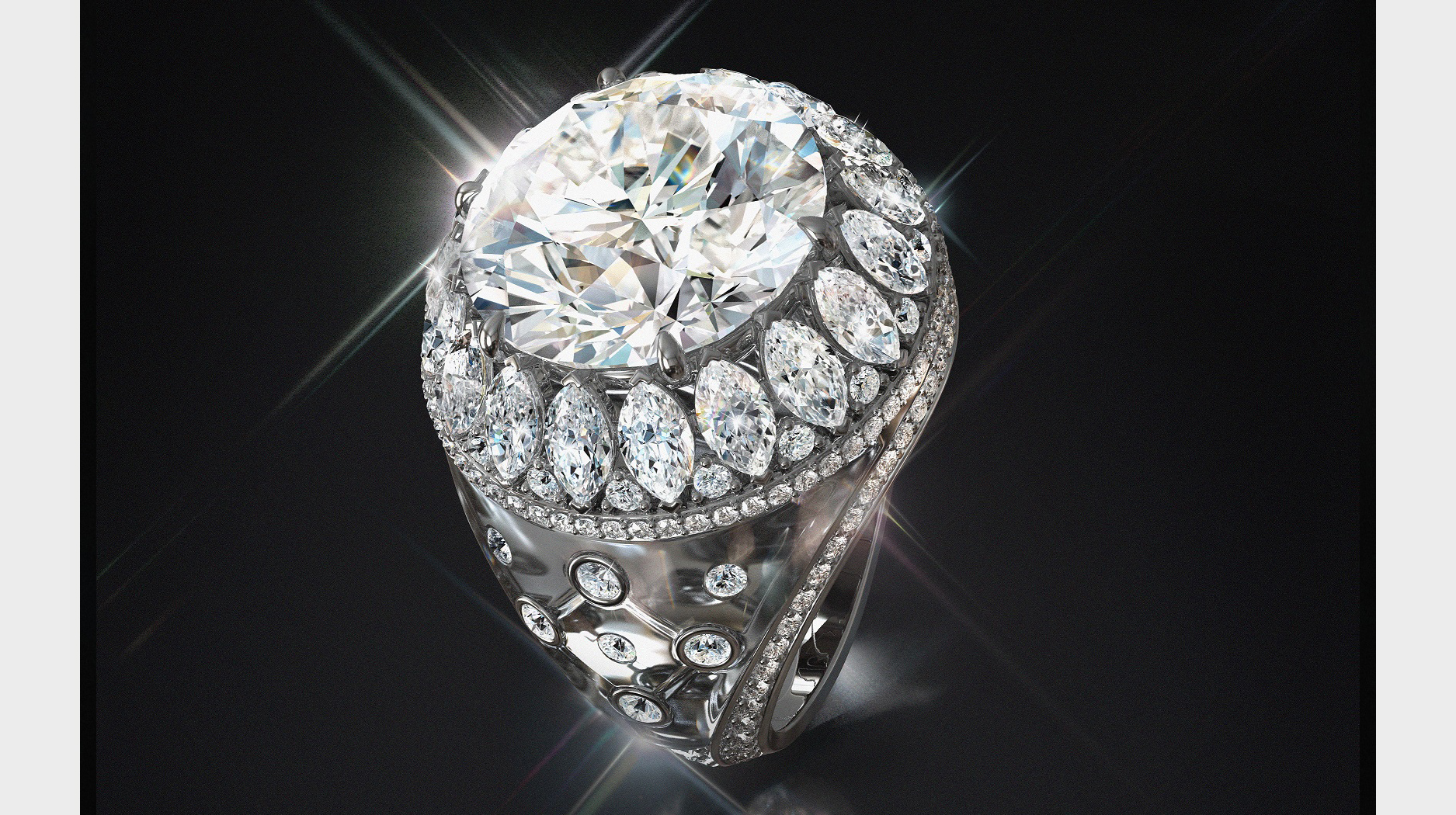 This ring features 14.68 total carats of diamonds, including a 10.31-carat round brilliant-cut diamond center stone.