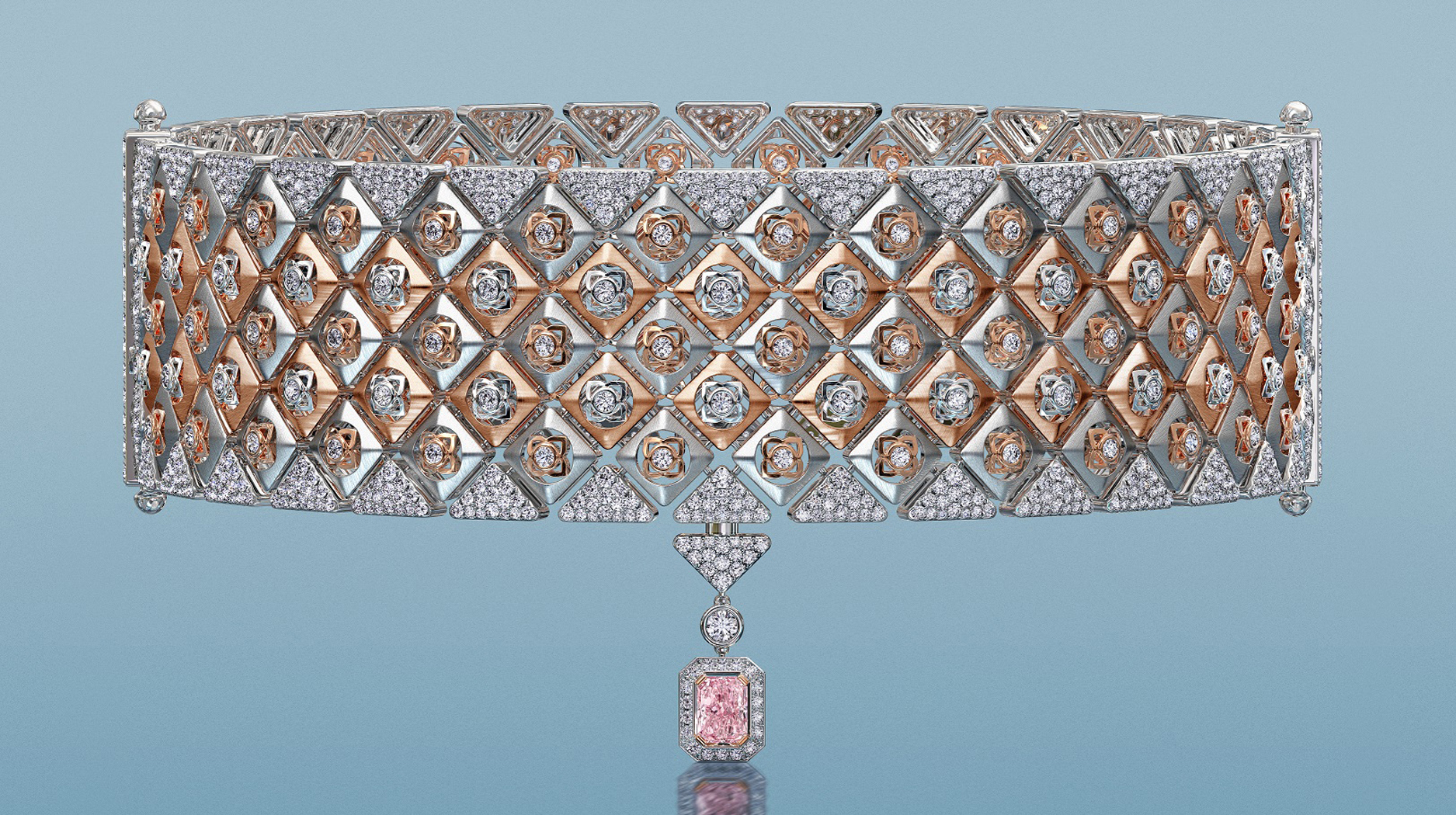 A flexible choker features a 1.13- carat, fancy intense pink radiant-cut diamond from De Beers’ Natural Works of Art collection. The choker transforms into a pair of cuff bracelets, and the pink diamond pendant is detachable to be worn on a longer necklace.