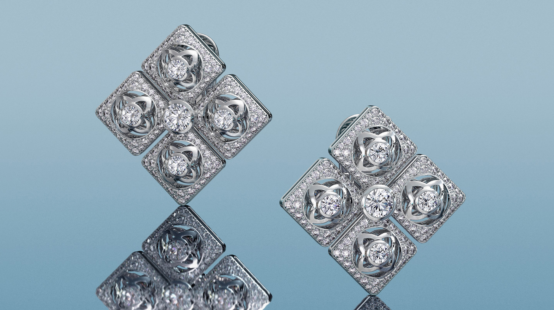 “Dusk Reflection,” for example, features De Beers’ abstracted lotus motif, featuring round diamonds atop a square setting. The set’s four jewels feature the repeated motif, symbolizing the daily rhythms of the lotus flower blooming and closing at night.
