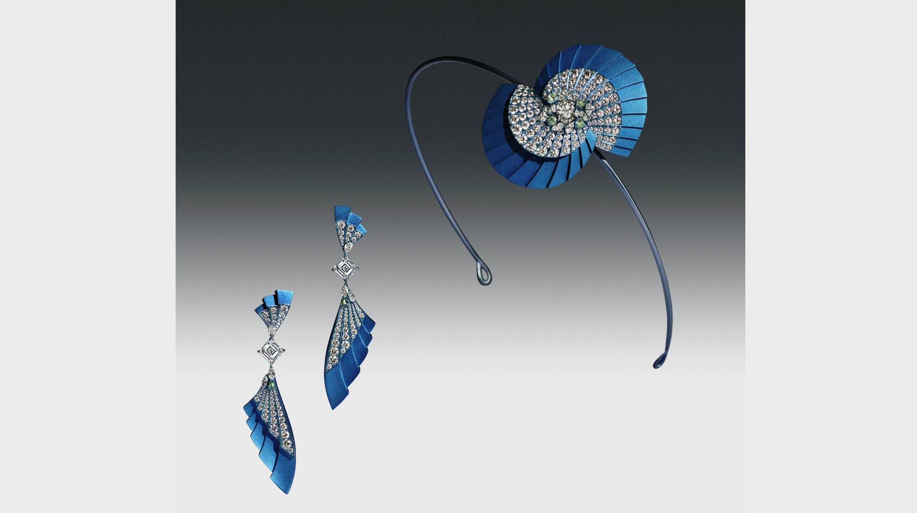 The headband features a total 17.22 carats of diamonds, including a 2.7-carat oval-shaped fancy gray diamond, while the drop earrings have a total 8.75 carats, including two 2.1-carat fancy dark gray emerald-cut diamonds.