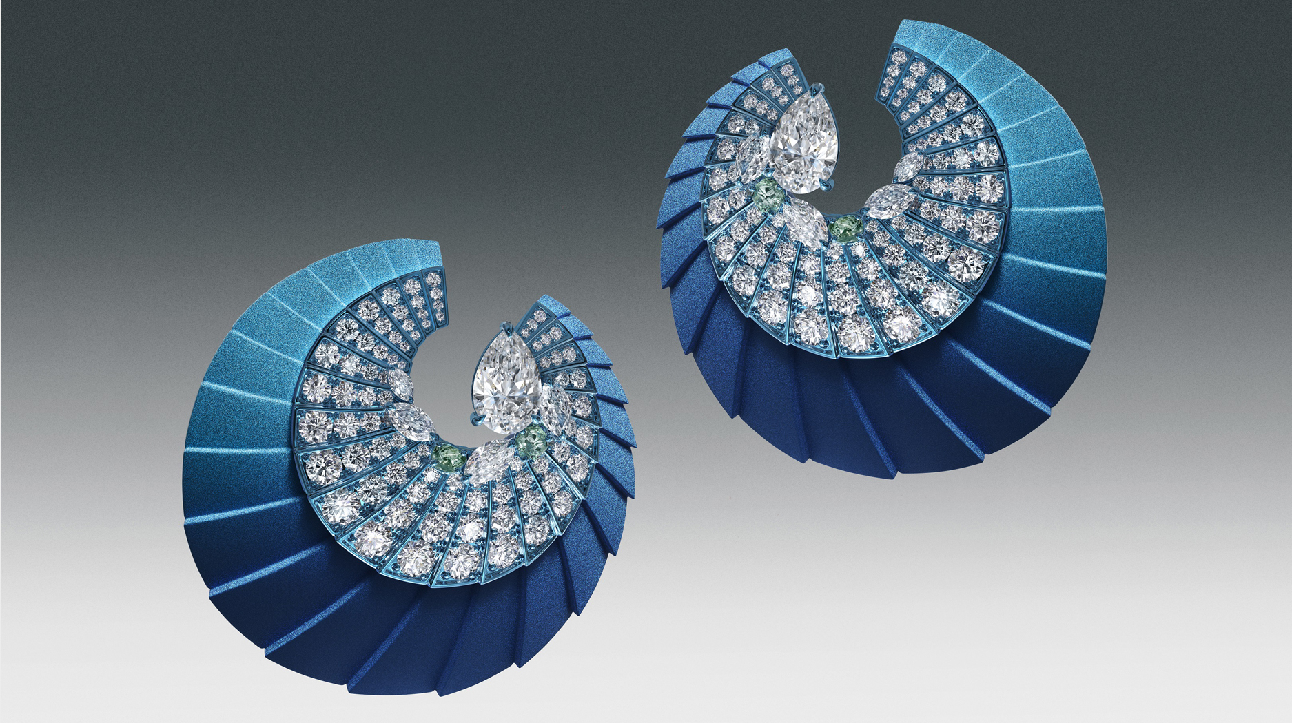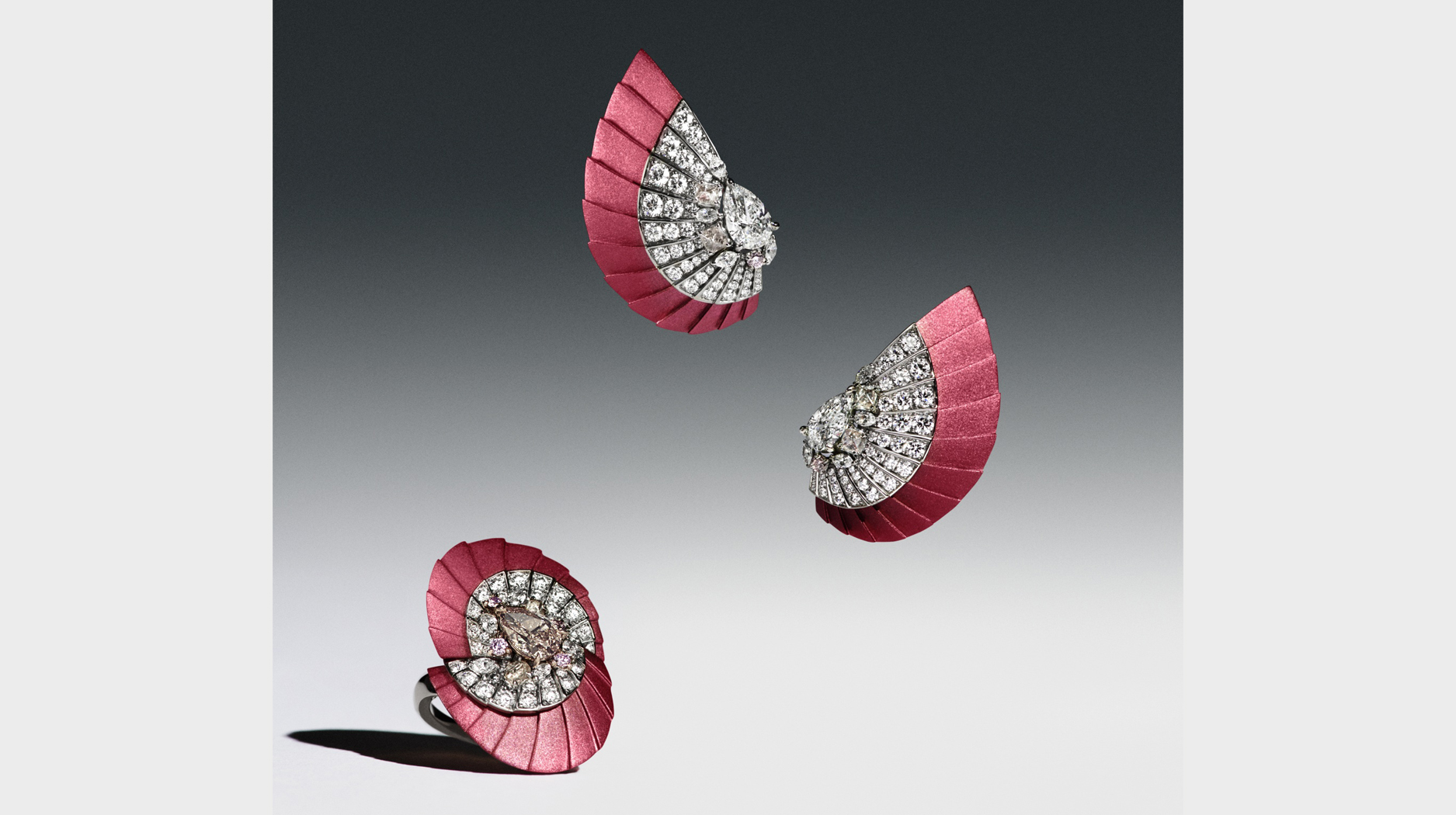 The second set of high jewelry, “Ascending Shadow,” conveys an entirely different energy, thanks to colorful anodized titanium and coated aluminum in shades of pink, blue, and green.