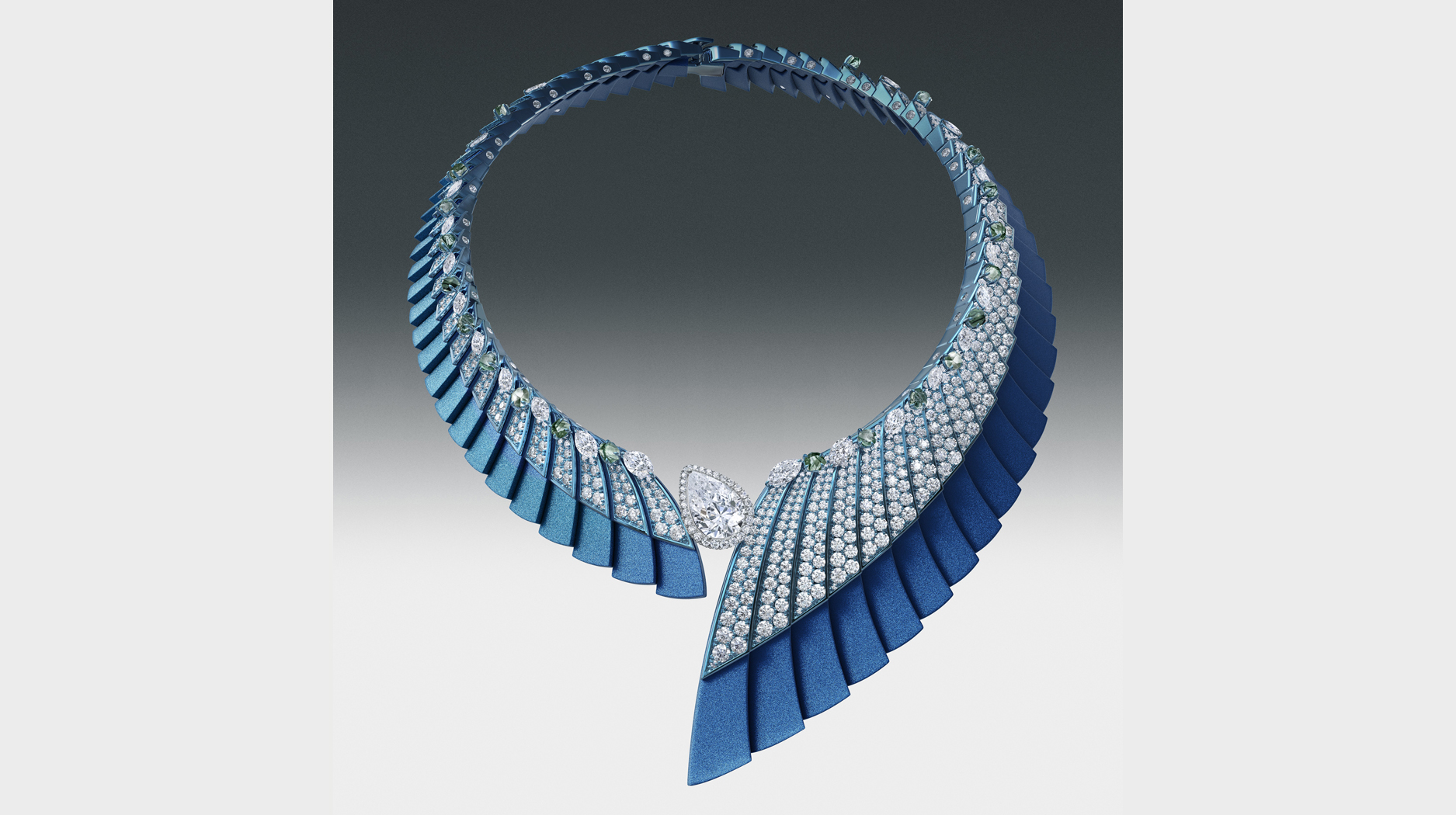 A necklace combining blue aluminum and diamond-set blue titanium is made of 142 individually articulated pieces as aluminum and titanium cannot be melded together.