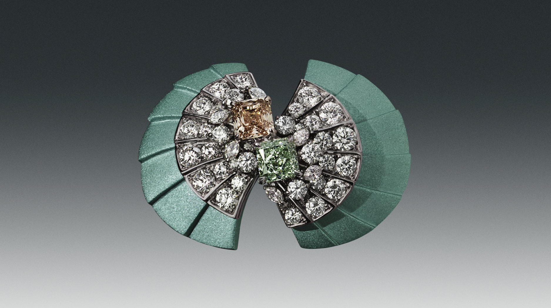 Finally, a green aluminum and titanium cocktail ring has a 1.11-carat Asscher-cut fancy orange-brown diamond and a 1.11-carat radiant-cut fancy yellowish-green diamond at center.