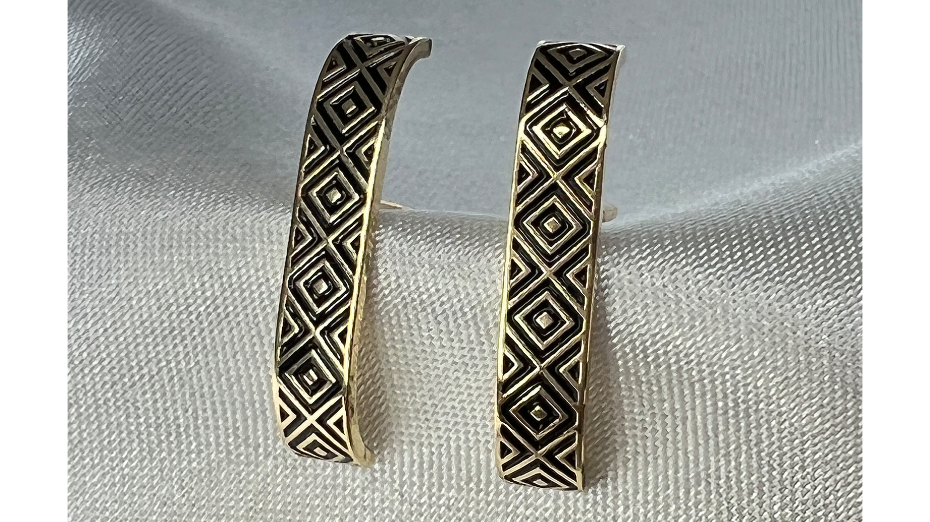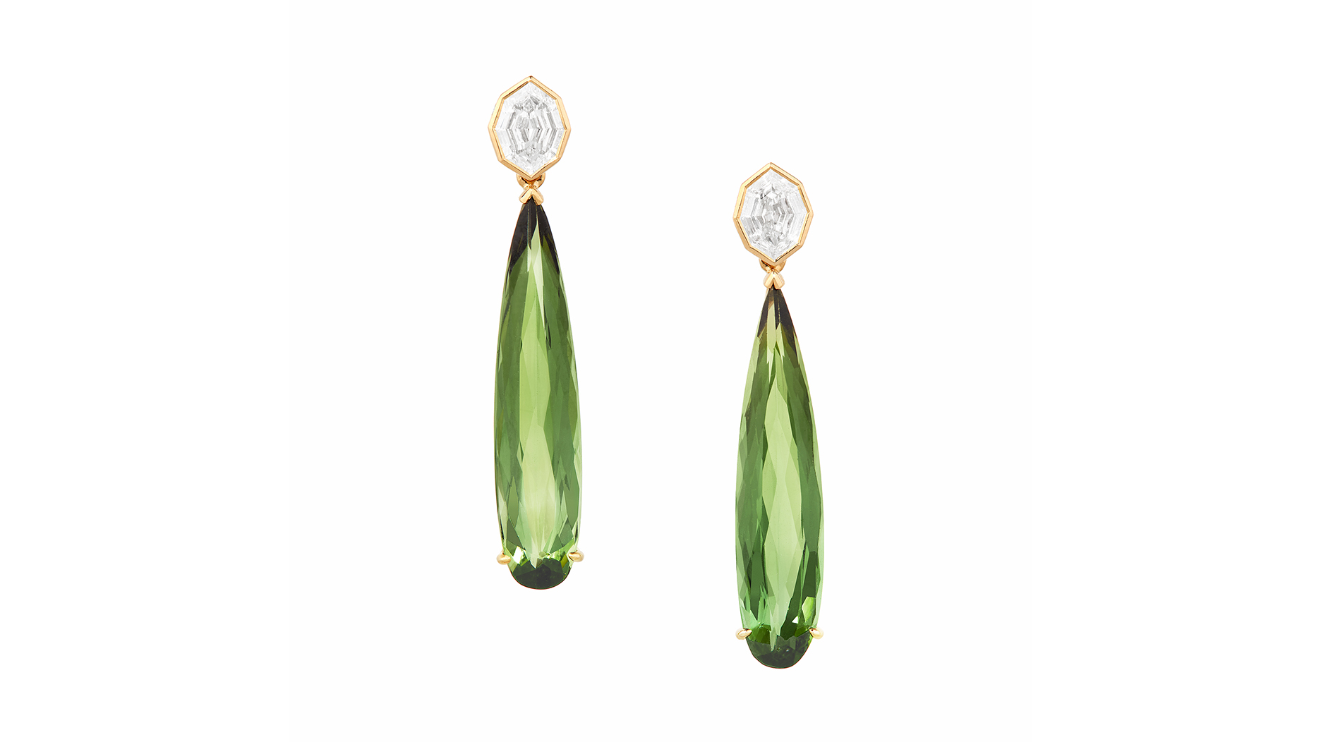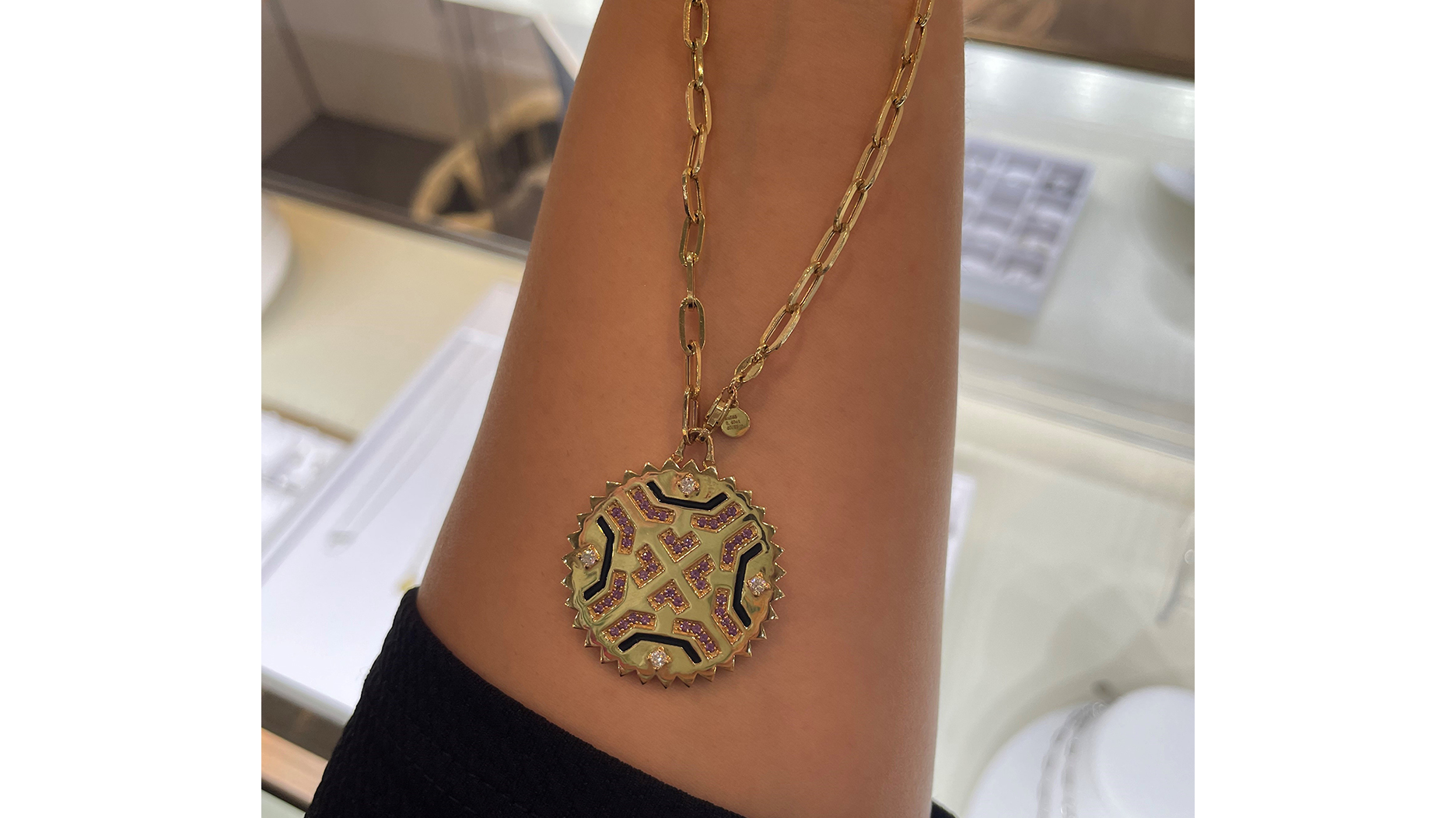 Her pieces feature geometric patterns and bright colored gemstones set in classic styles.