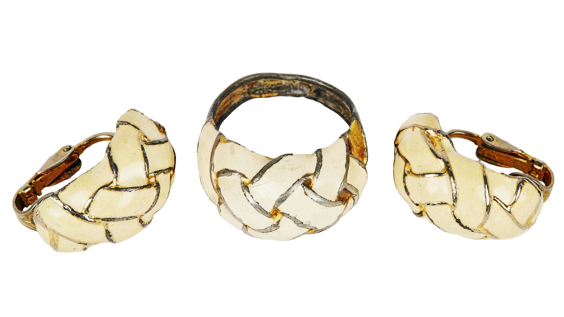 Another signed piece, a vintage Ruser 14- and 18-karat gold fortune cookie brooch, sold for $5,760, near the top of its estimated range, while a costume jewelry set—a pair of cream-colored ear clips and a matching ring White wore on several episodes of The Golden Girls—sold for $12,800.