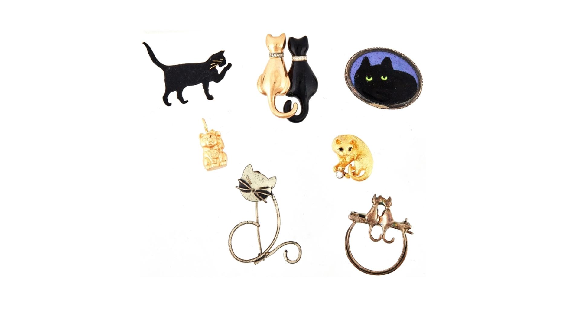 My favorites—the “gold tone” and black enamel cats with CZ collars sitting side by side at top and their black enamel friend licking his paw to the left. Fun note: the kitty at right in the middle is 18-karat gold with a round diamond and is signed “Tiffany Germany.”