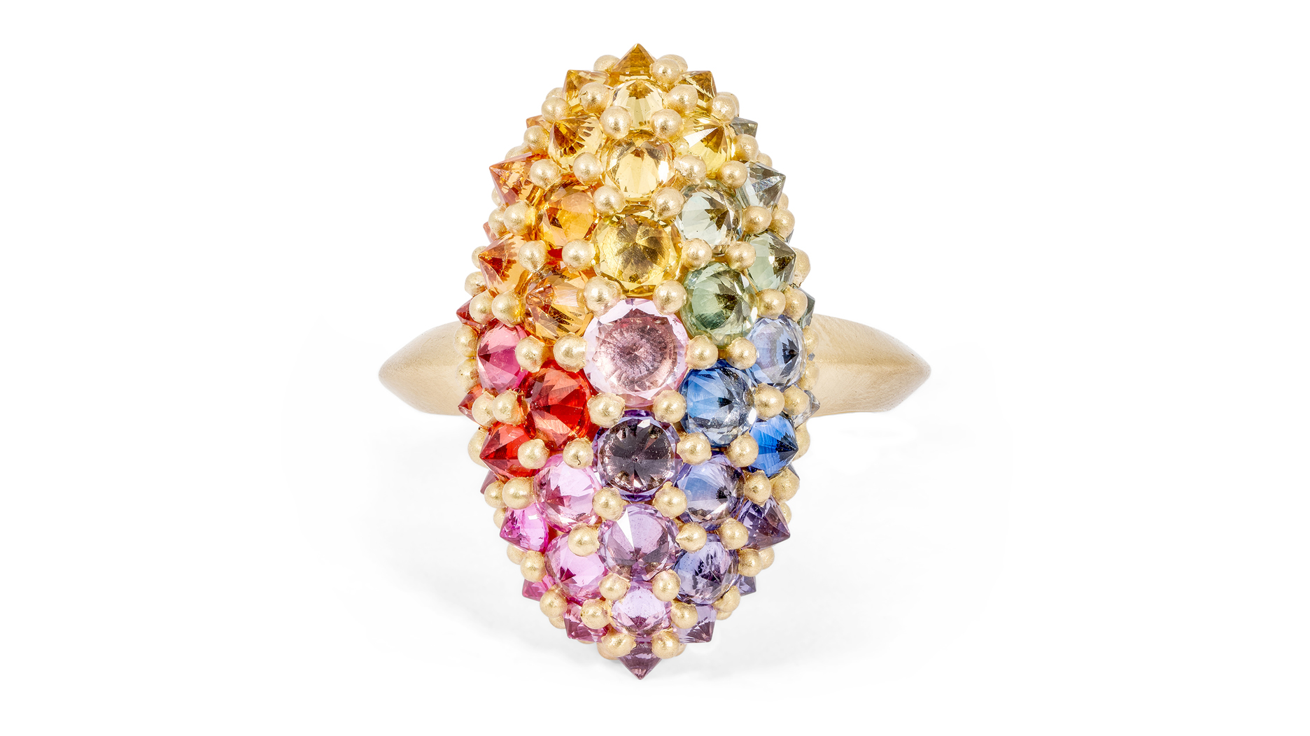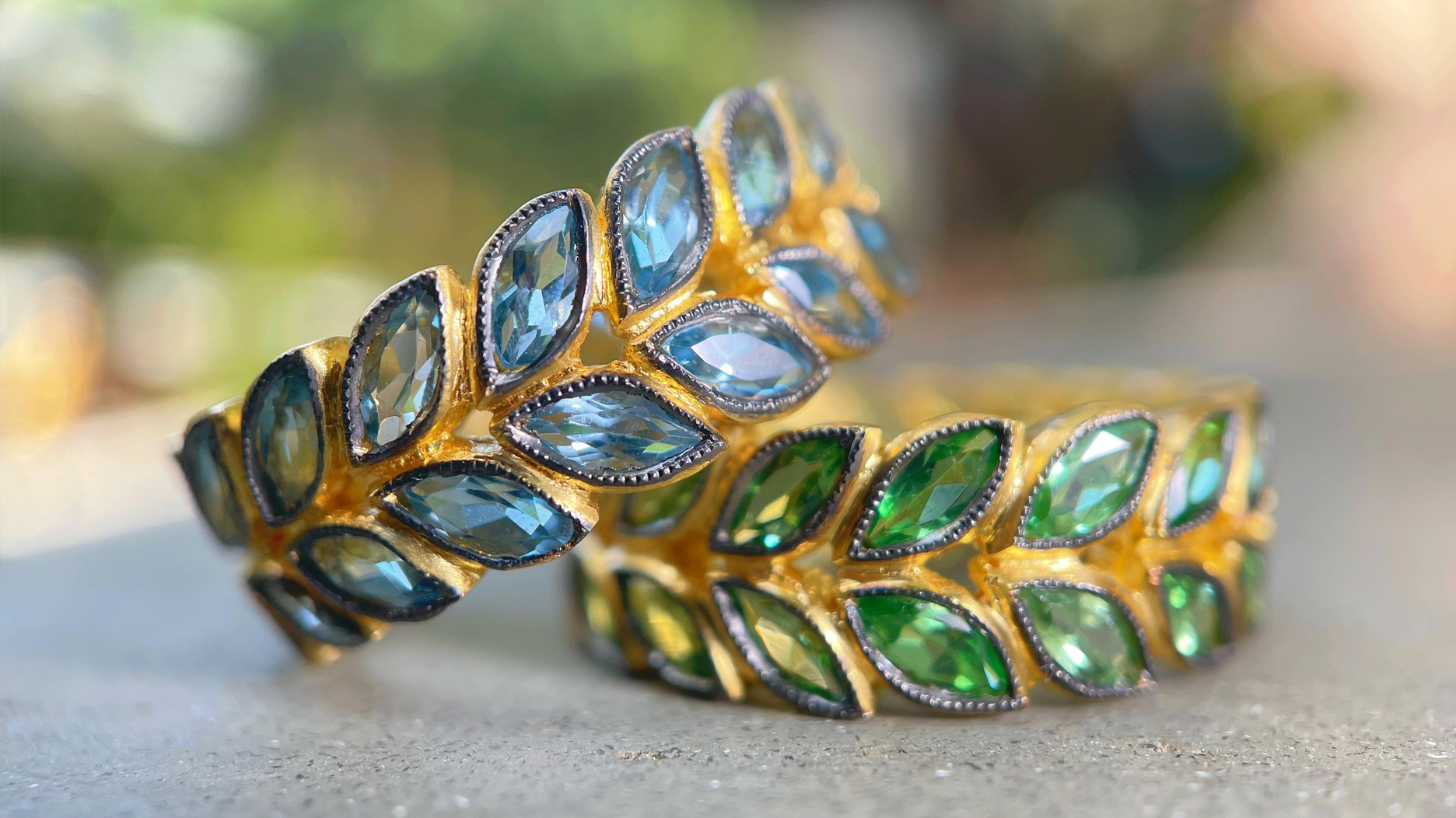 Cathy Waterman 22-karat gold rings with sapphires and emeralds. Waterman is the first fine jewelry brand Twist stocked, nearly three decades ago.