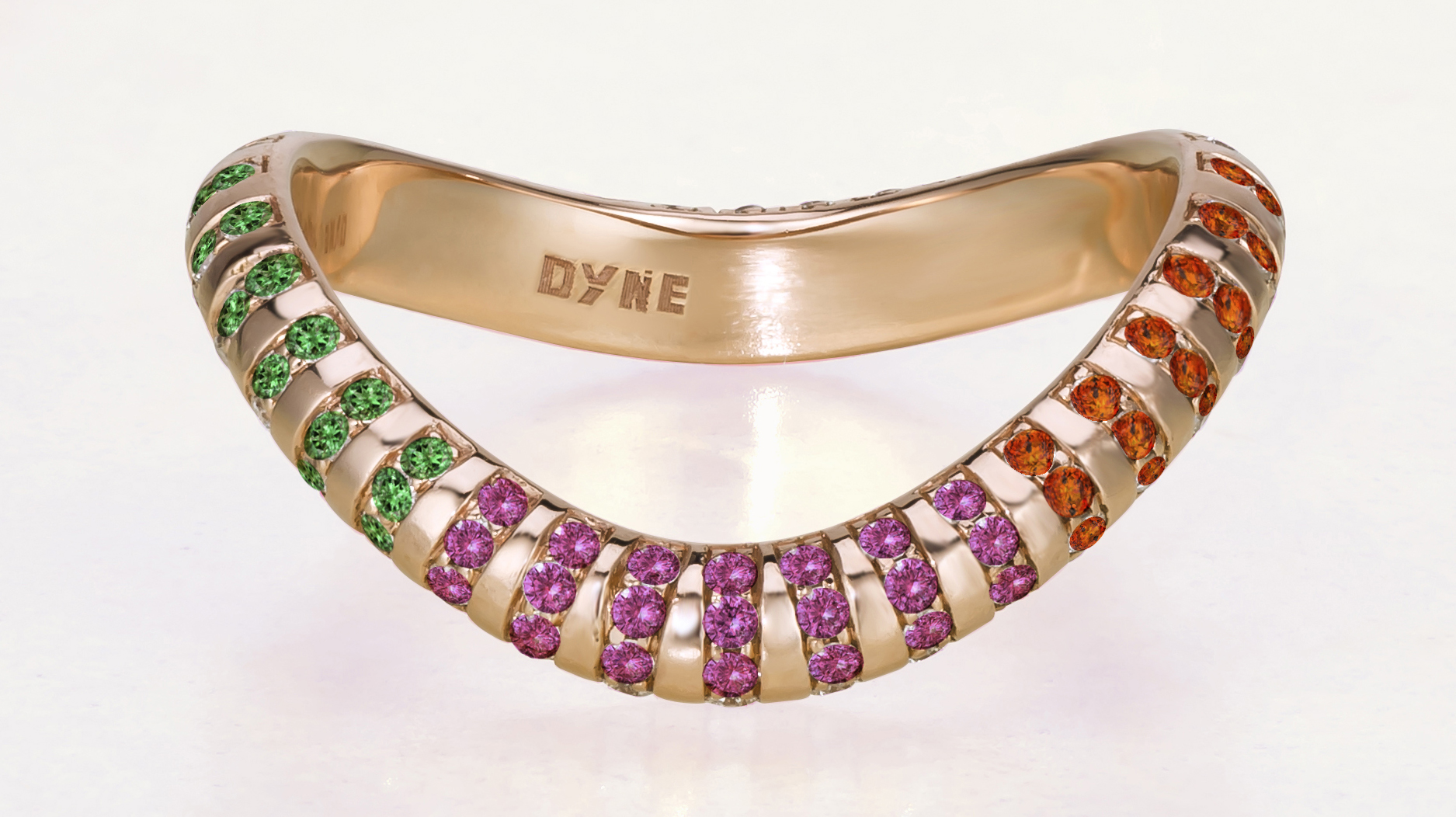Dyne’s “Archery Ring” in 18-karat rose gold with pink and orange sapphires and tsavorite garnets ($5,790)