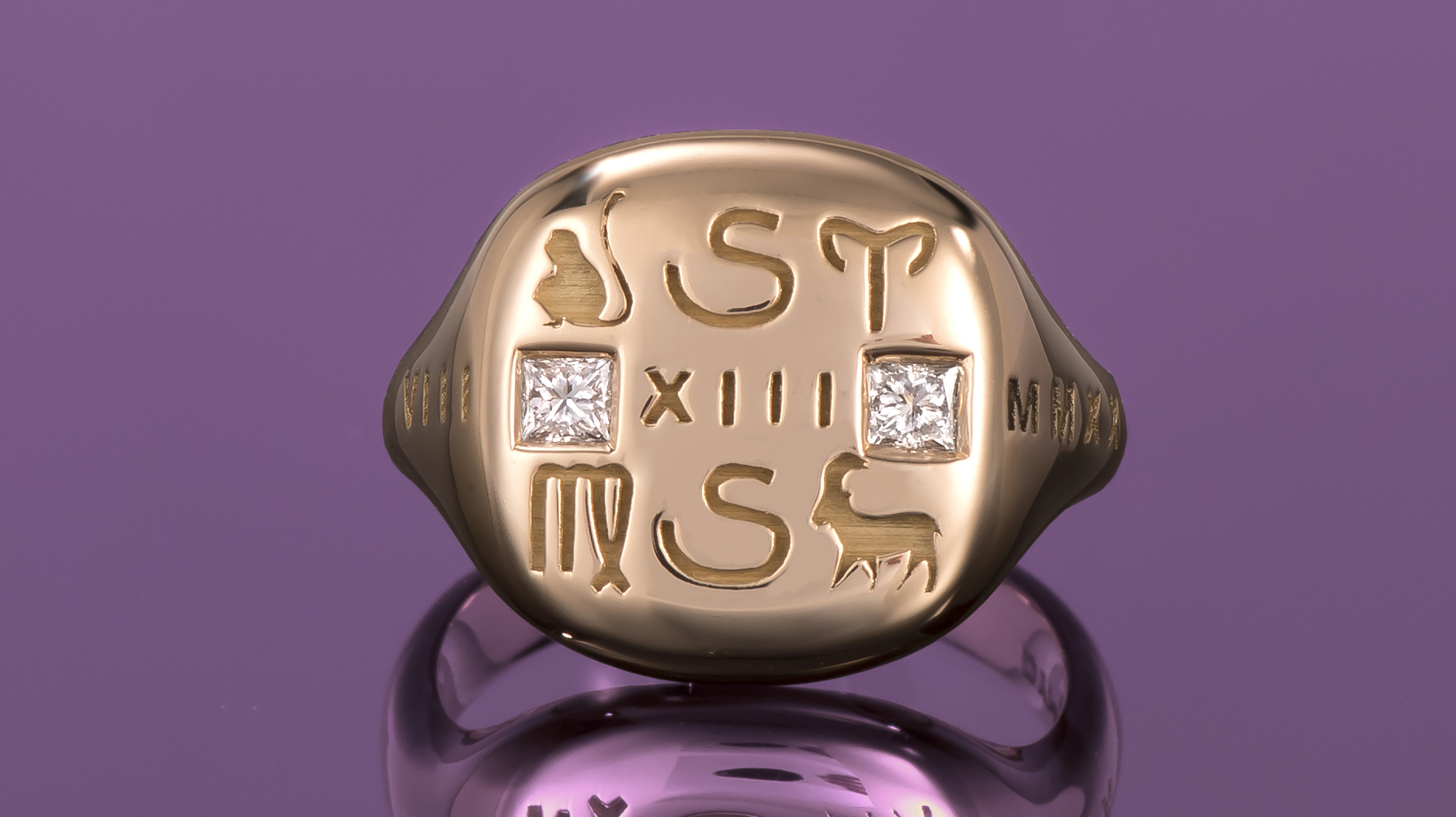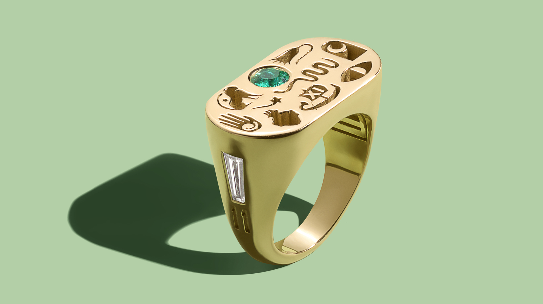 A custom “LoverGlyphs” ring in 18-karat yellow gold with emerald diamonds (custom pricing begins at $4,200)