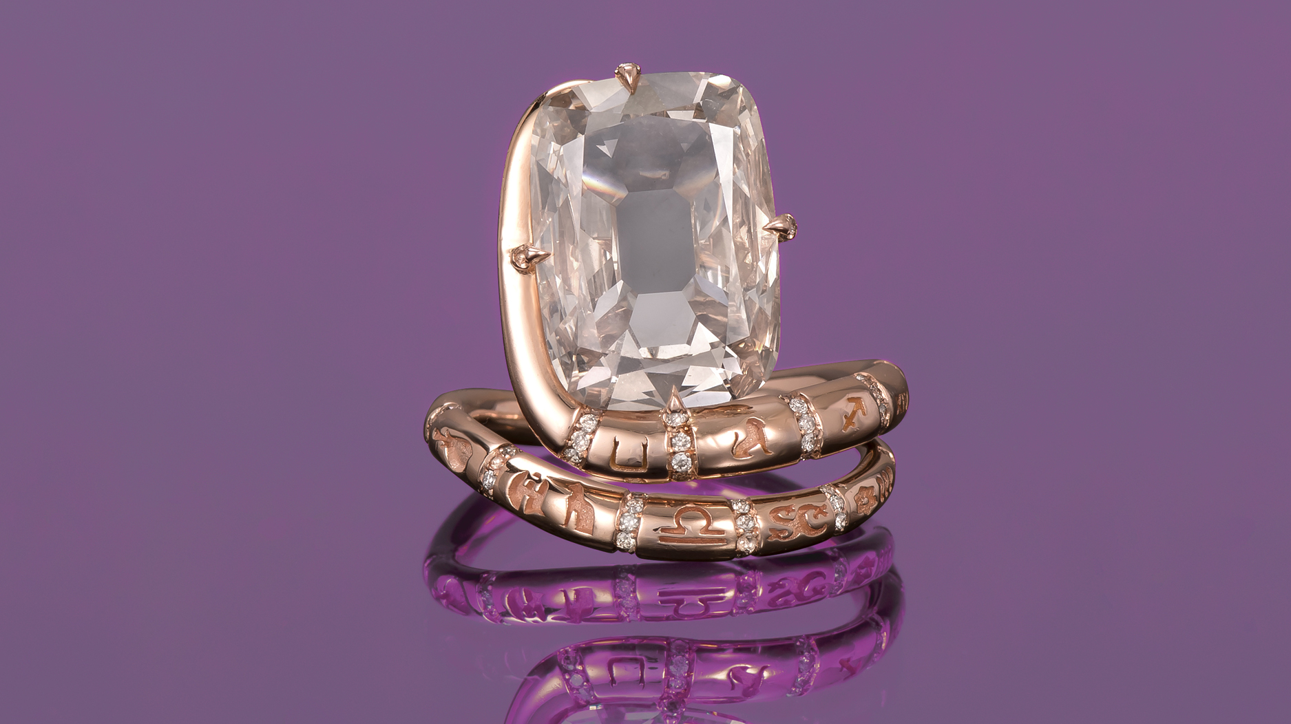 A custom “LoverGlyphs” pinky ring in 18-karat rose gold with diamonds (custom pricing begins at $4,200)