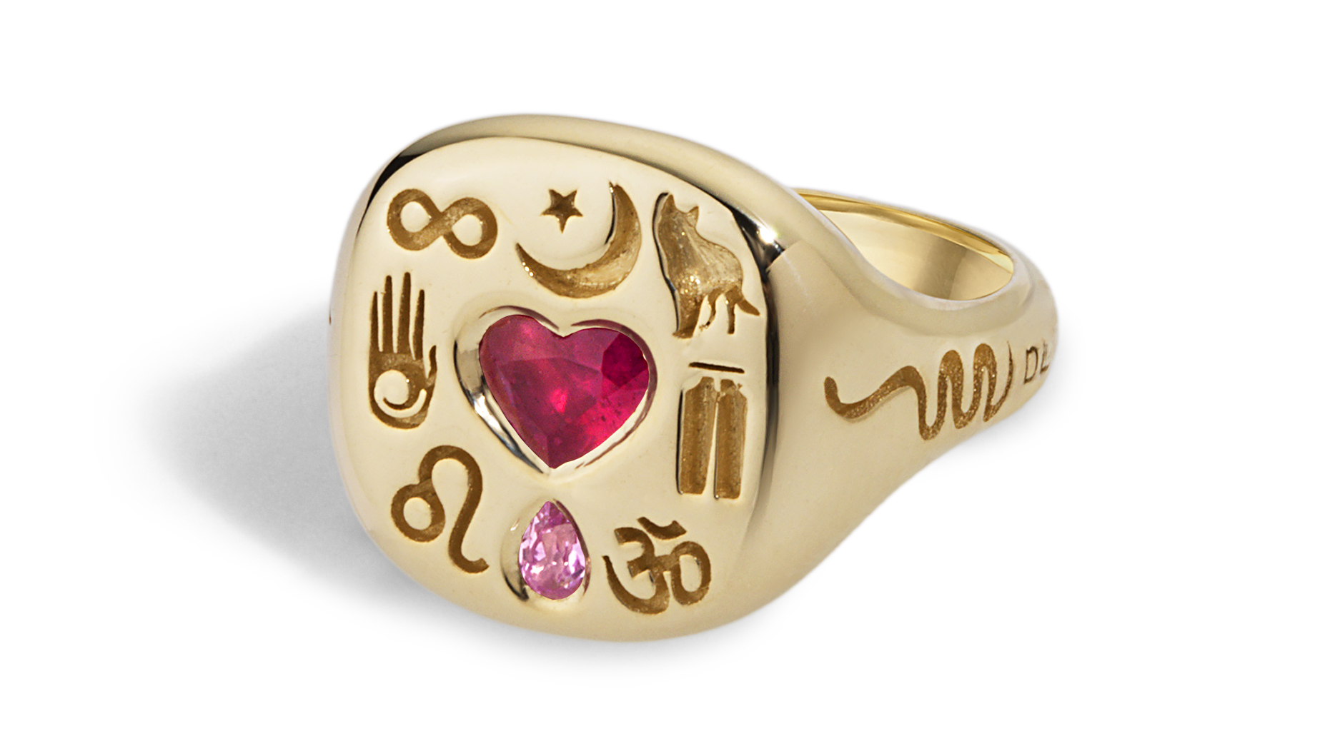 A custom “LoverGlyphs” ring in 18-karat yellow gold with ruby and pink sapphire (custom pricing begins at about $4,200)