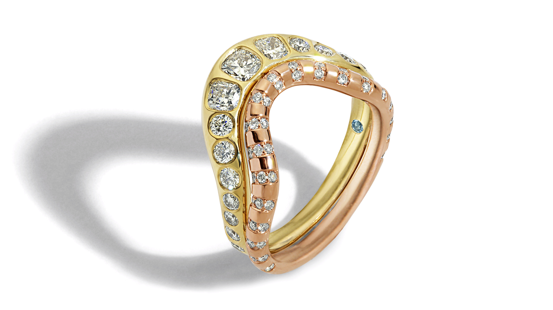 The “Archery” bridal stack featuring 18-karat yellow gold ring with diamonds (price available upon request) and 18-karat rose gold ring with diamonds ($7,245)