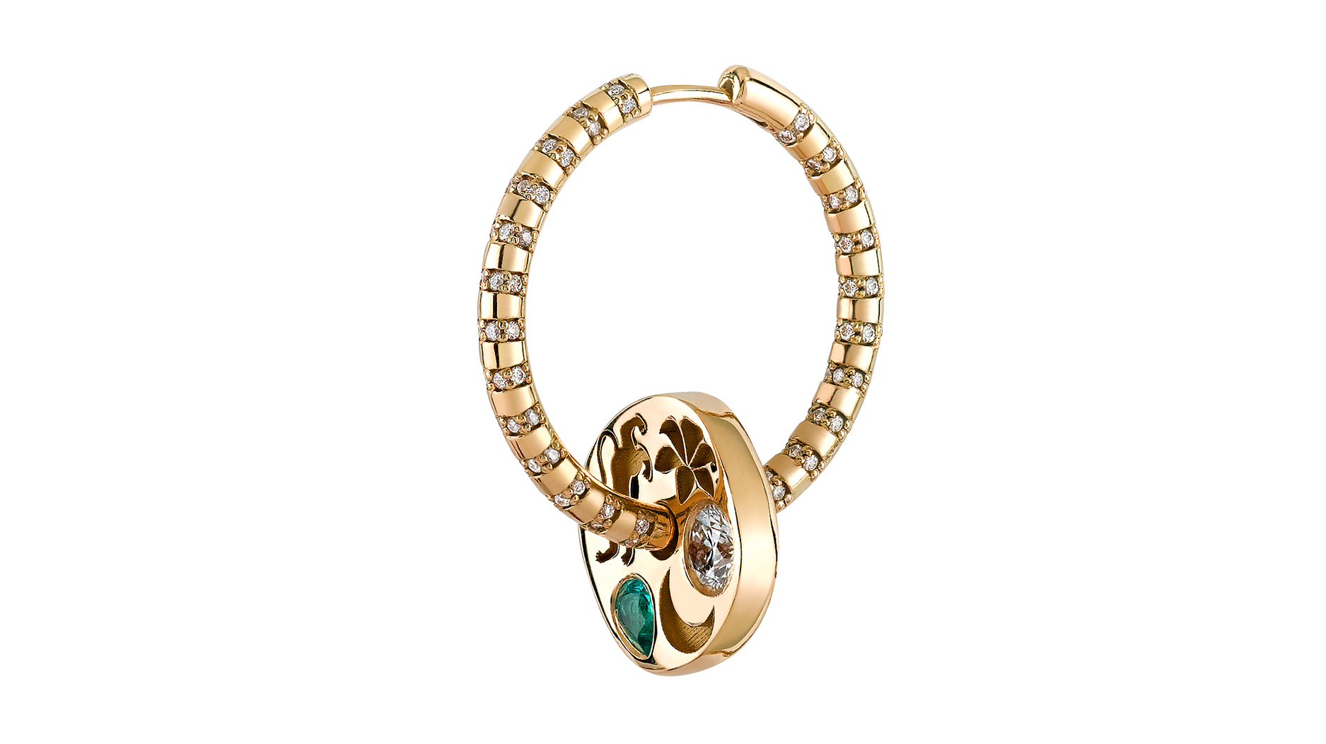 “Amulet” single hoop earring in 18-karat yellow gold with diamond and emerald ($5,790)
