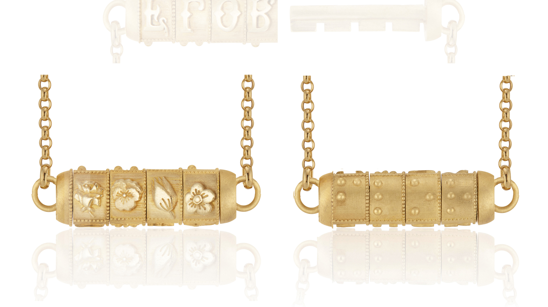 The collection centers on five different locks, each with a different meaning. Locks are functional, acting as the necklace closure. The lock and key will only work when each message is correctly lined up.