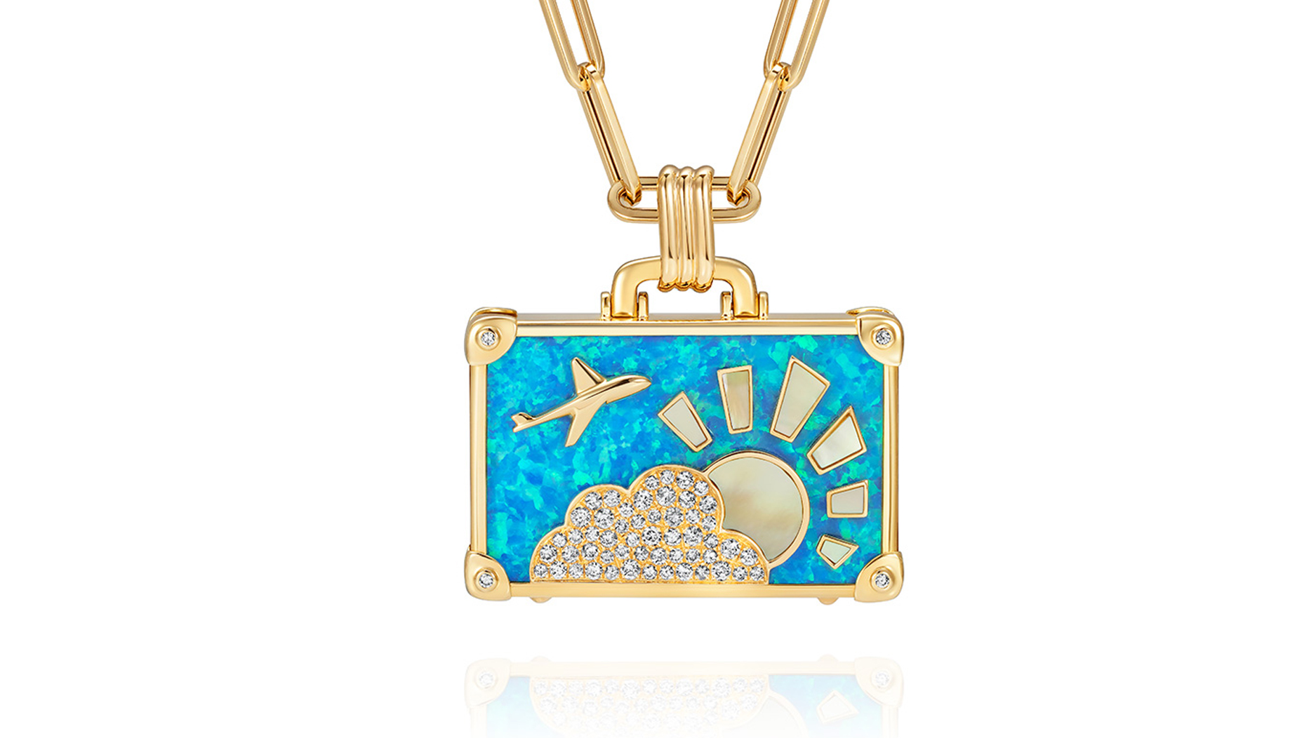 Called the “Beach Escape” necklace, it features a “suitcase” pendant in 14-karat yellow gold with opal, white diamonds, tiger’s eye, and yellow mother-of-pearl.