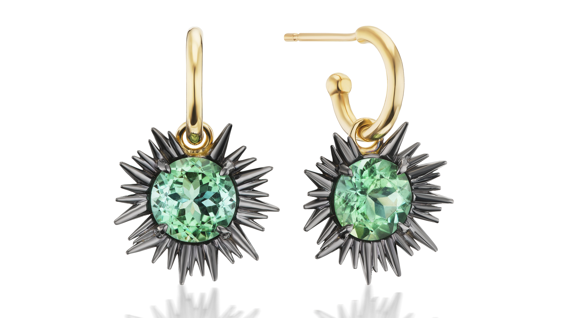“Uni Drop Earrings” in 14-karat yellow gold with black rhodium and 4.34 total carats of green tourmaline ($4,860)