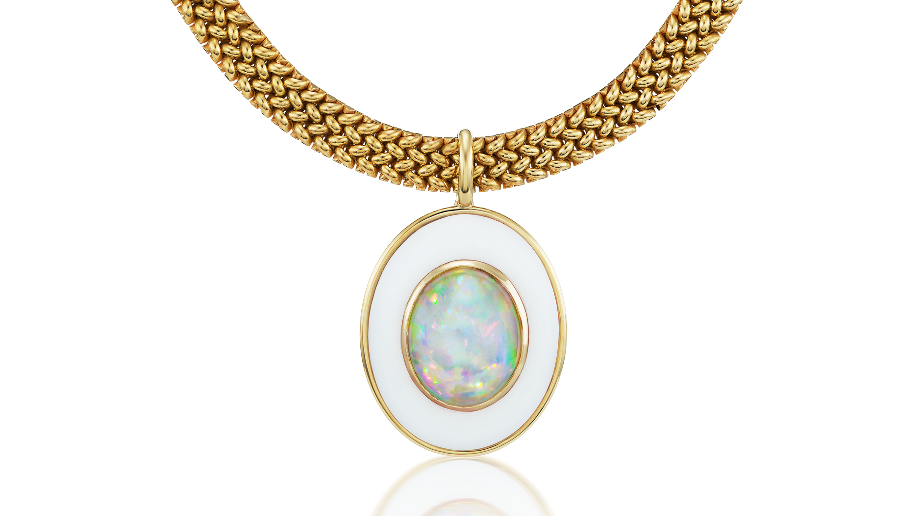 “Astral Necklace” with woven chain in 18-karat yellow gold with a 17.25- carat Ethiopian opal and white agate ($15,170)
