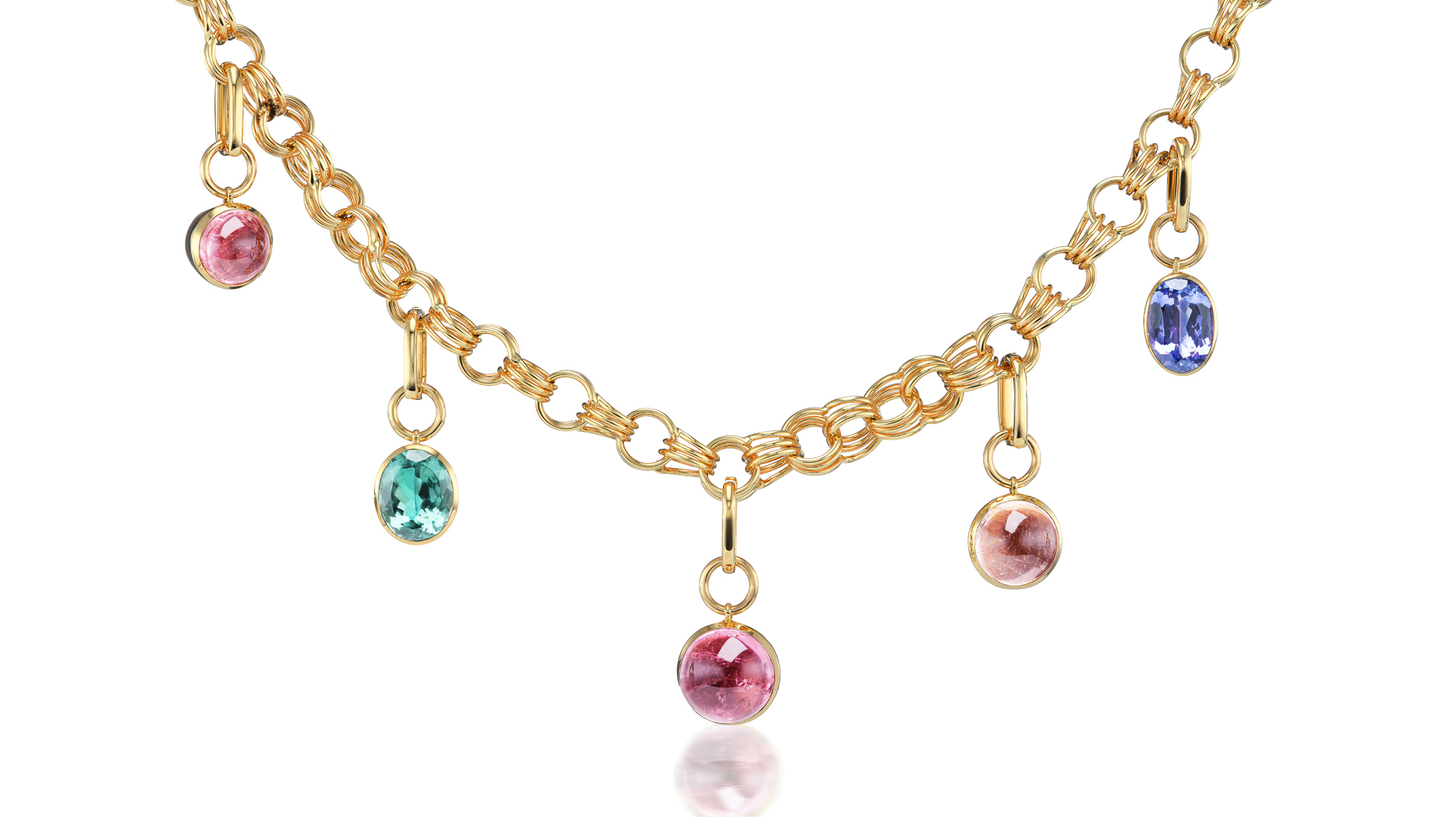 “Triple Link Chain” in 14-karat yellow gold with removable charms in 14-karat yellow gold and 12.24 total carats of pink tourmaline, 4.14 carats of green tourmaline and 4.28 carats of tanzanite ($24,950)