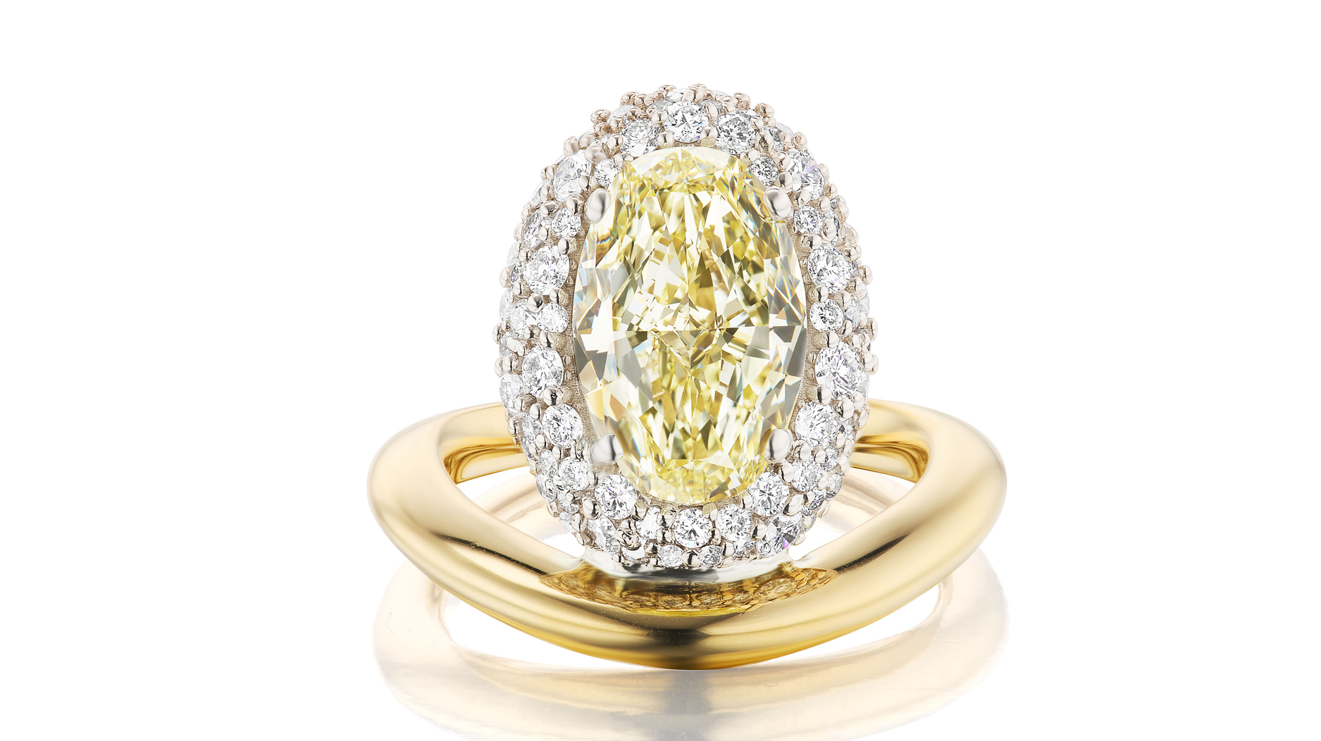The “Perch Ring” in 18-karat white and yellow gold with 3.24 fancy yellow antique diamond and white diamond pavé ($42,350) is from Arielle Ratner’s new engagement ring collection.