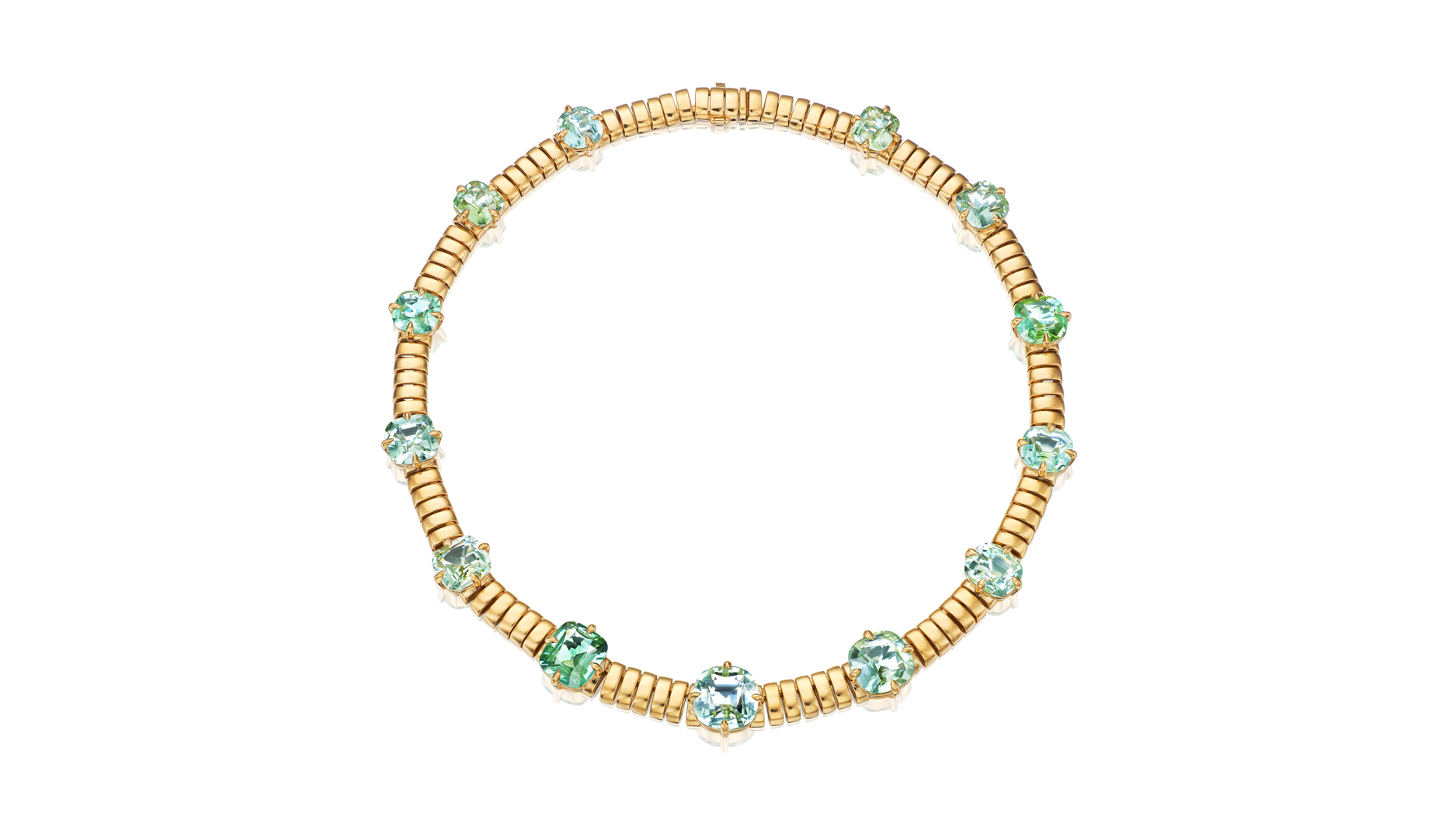 “Gatsby Trove Collar” in 18-karat yellow gold with 79.8 total carats of seafoam green tourmaline ($65,400)