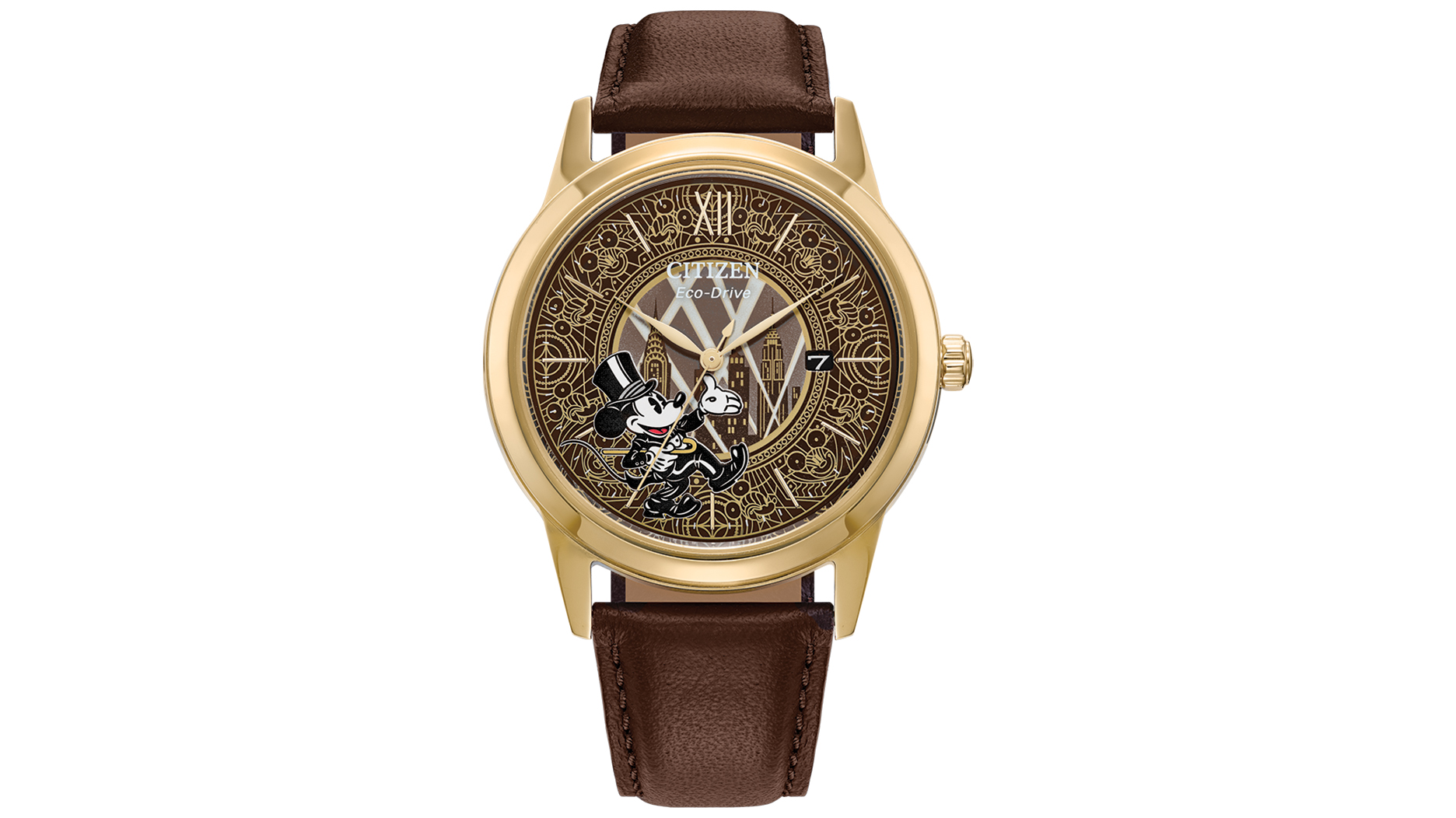 The special edition 40 mm Mickey Mouse Fanfare watch has a gold-tone stainless steel case with a brown textured leather strap and features Mickey in a top hat on the dial. Along the outer border of the dial are hidden Mickeys in a 1920s Art Deco style. It also comes with a collectible pin.