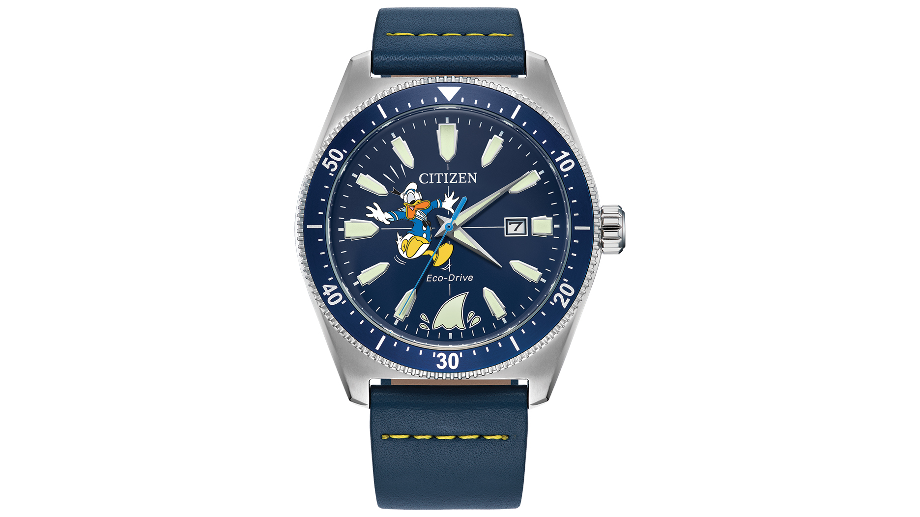 The new Disney Donald Duck watch shows the character trying to escape a shark, a callback to a short called “Sea Scouts,” said designer Jeff Shelley.