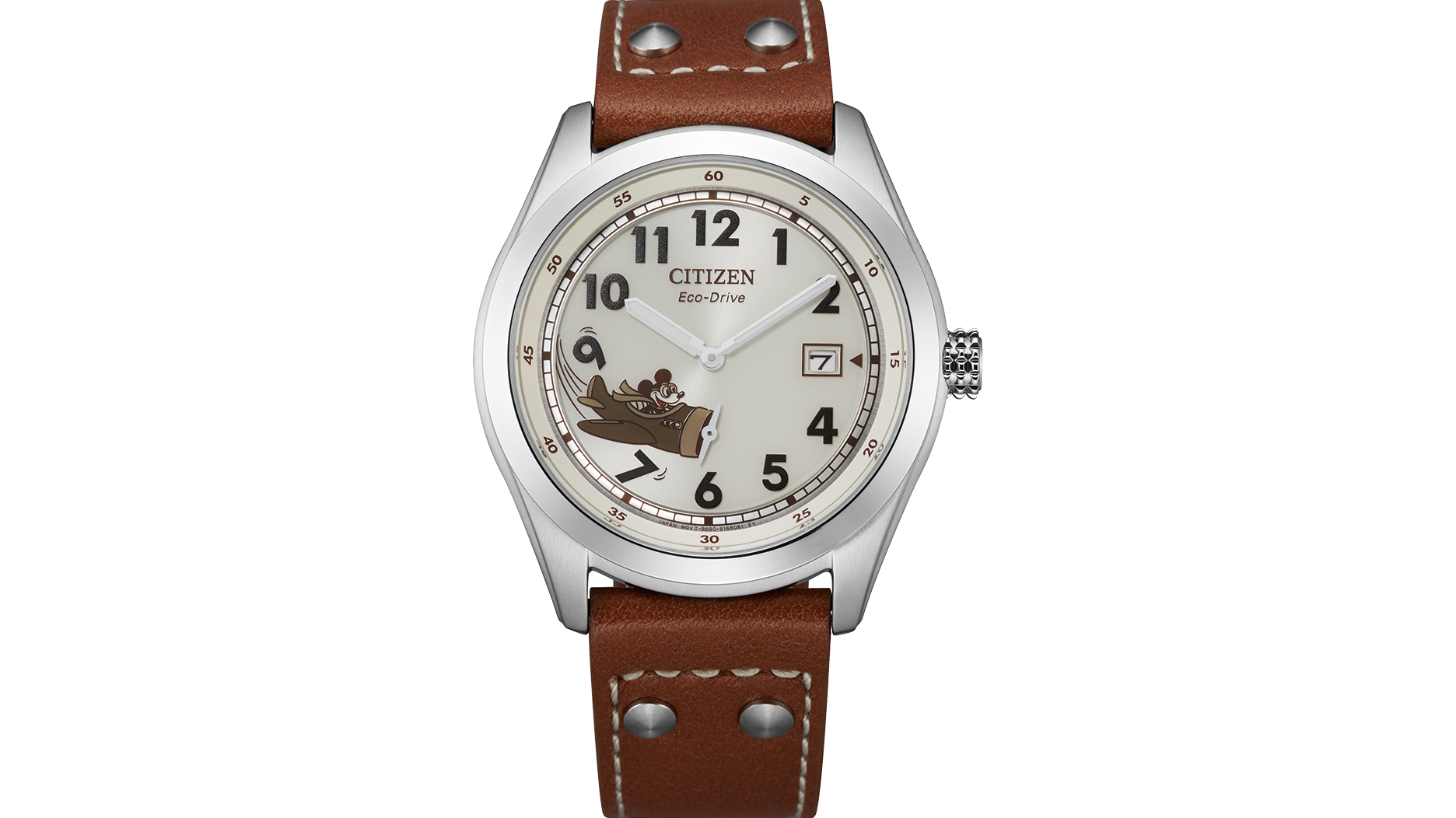The 40 mm watch has a tan leather strap with ivory topstitch and rivets with a stainless steel case and an ivory dial, featuring Mickey Mouse flying a vintage airplane. The plane’s propeller is the sub second hand.