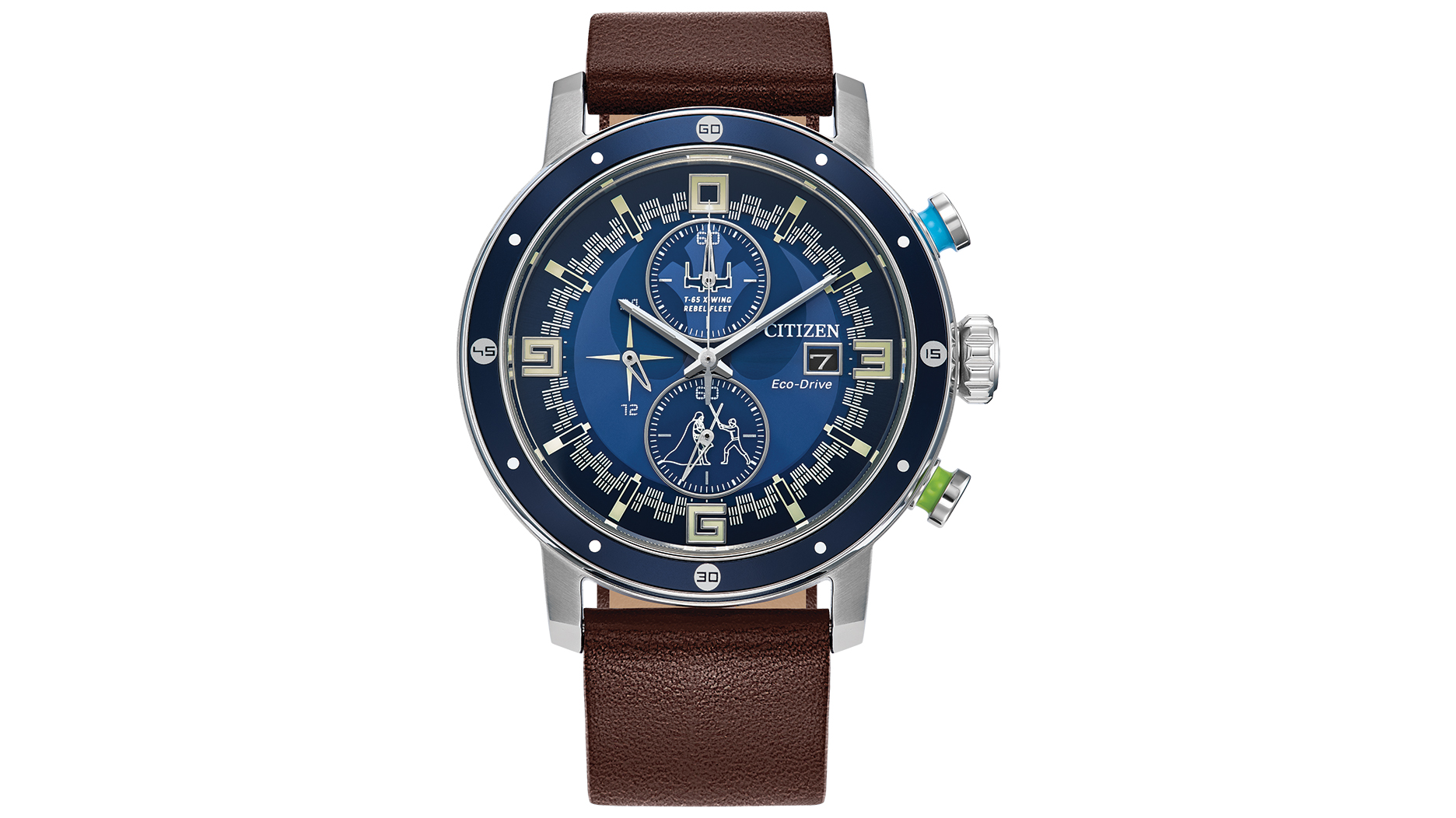 The Luke Skywalker watch features a 44 mm blue dial and bezel and a brown leather strap and is water resistant to 100 meters. The caseback reads, “The Force is strong with this one.”