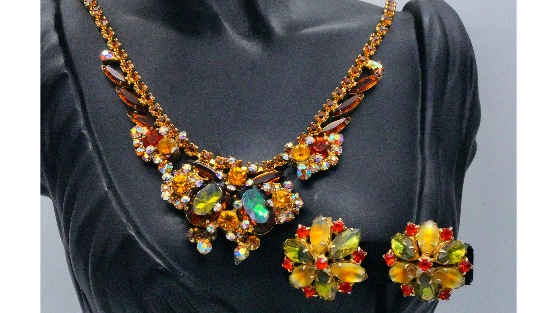There is also a matching necklace and earrings set worn by Gardner. The gold-tone jewels are set with amber, brown, and green iridescent rhinestones.