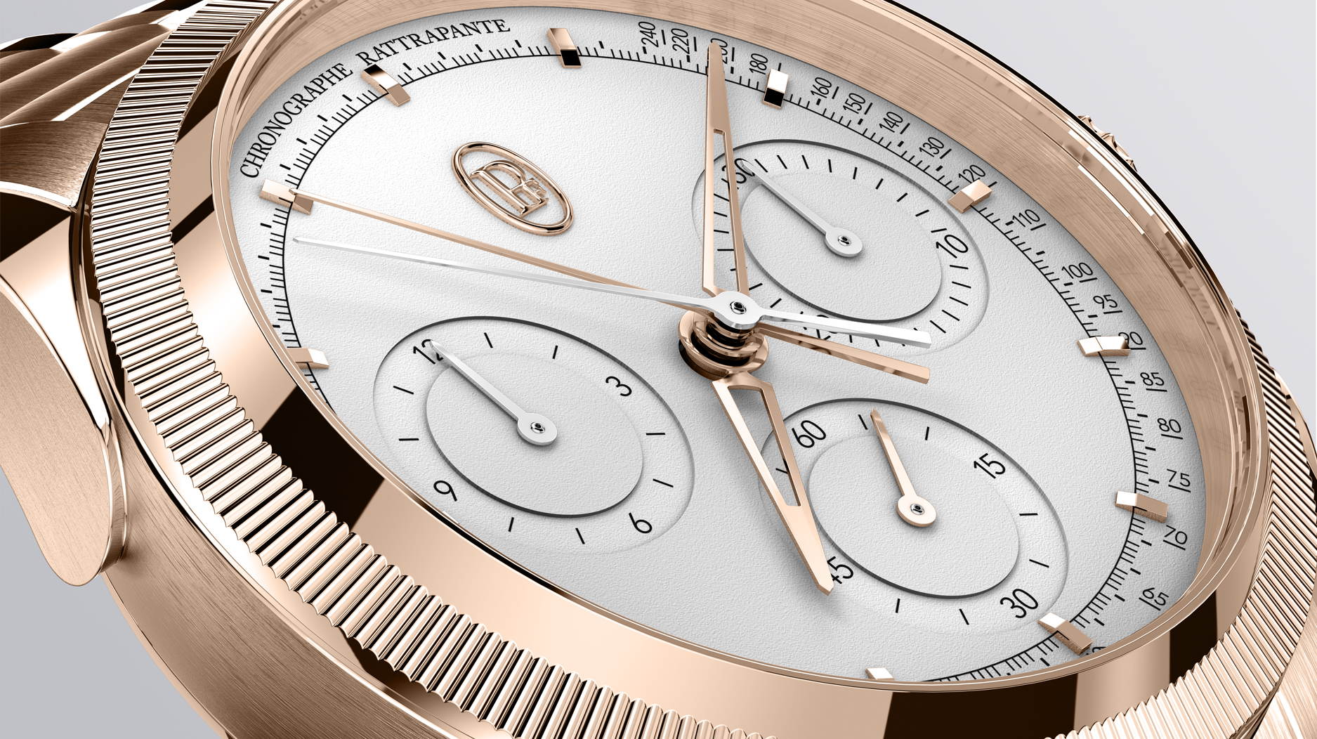 This year, the Tonda PF Split Seconds Chronograph, or Tonda PF Chronograph Rattrapante, is available in rose gold case and bracelet with a platinum dial.