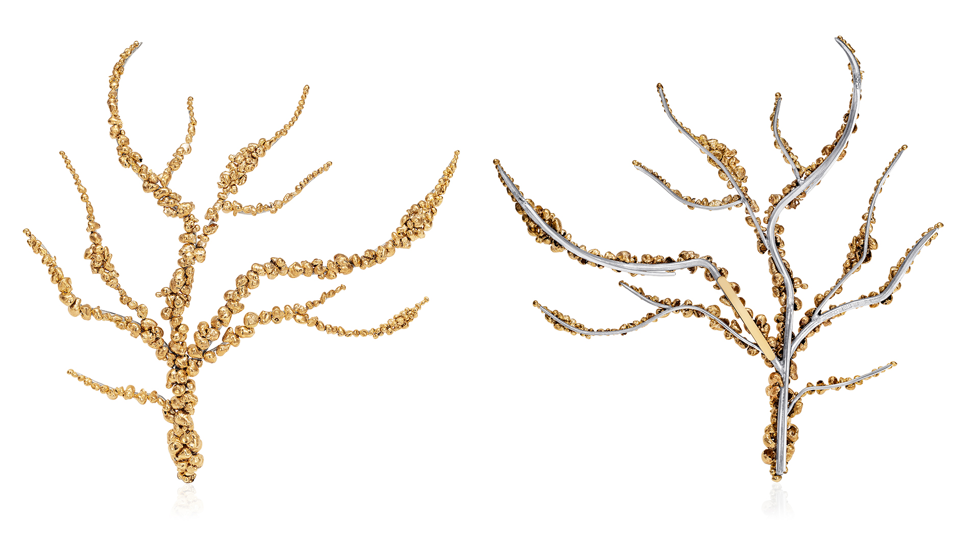 Cole designed and made every piece in Worth Their Weight, except for Coel’s hairpiece. For that, she collaborated with 28-year-old jeweler Benjamin Hawkins, with whom she shares a space at The Goldsmiths’ Centre, a creative community founded by The Goldsmiths’ Company. The piece has both their hallmarks on it.