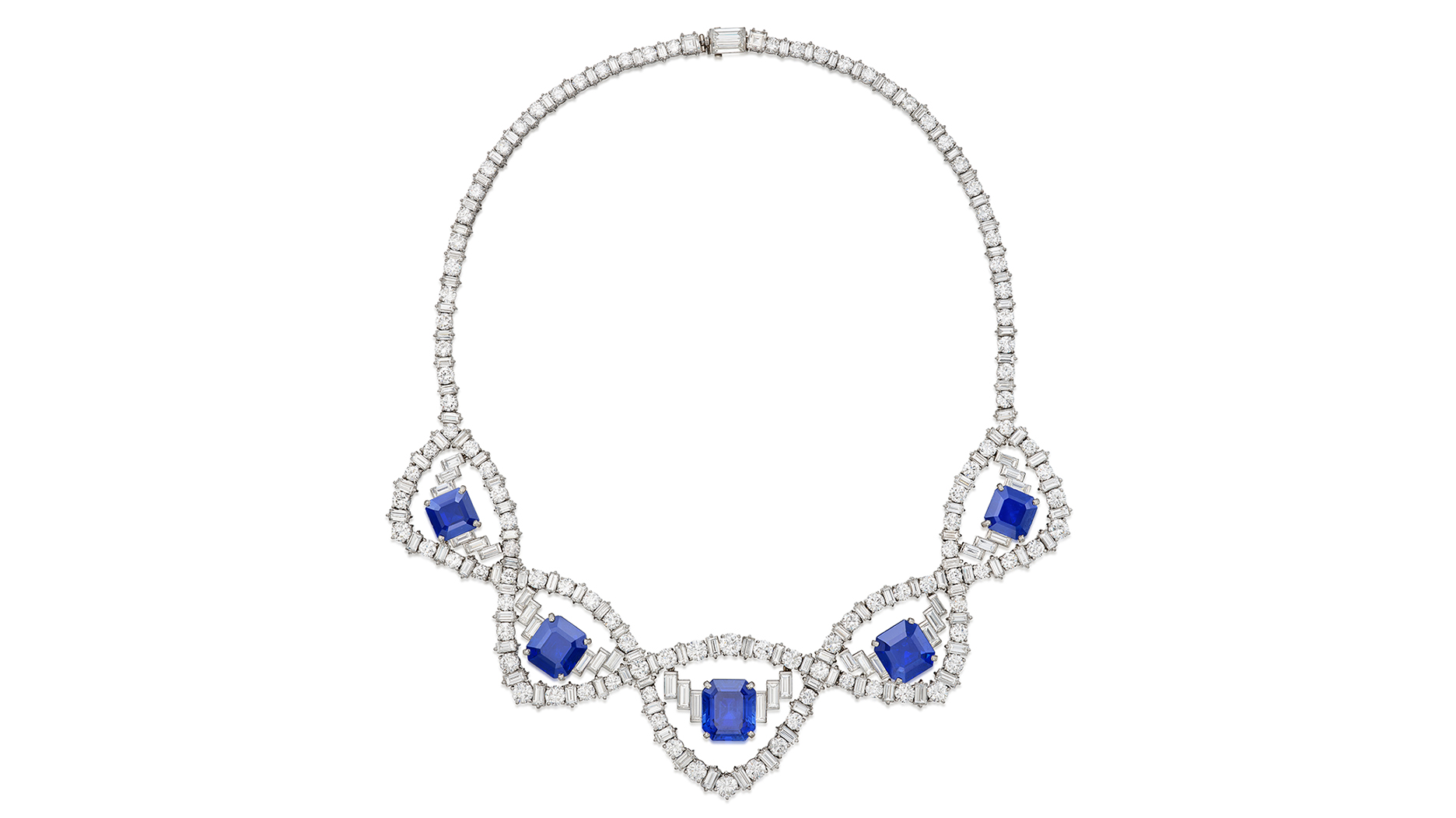 The first offering is a 1950s Cartier necklace featuring five Kashmir sapphires, weighing a total of approximately 34.95 carats, and accented by round, baguette, and square-cut diamonds.