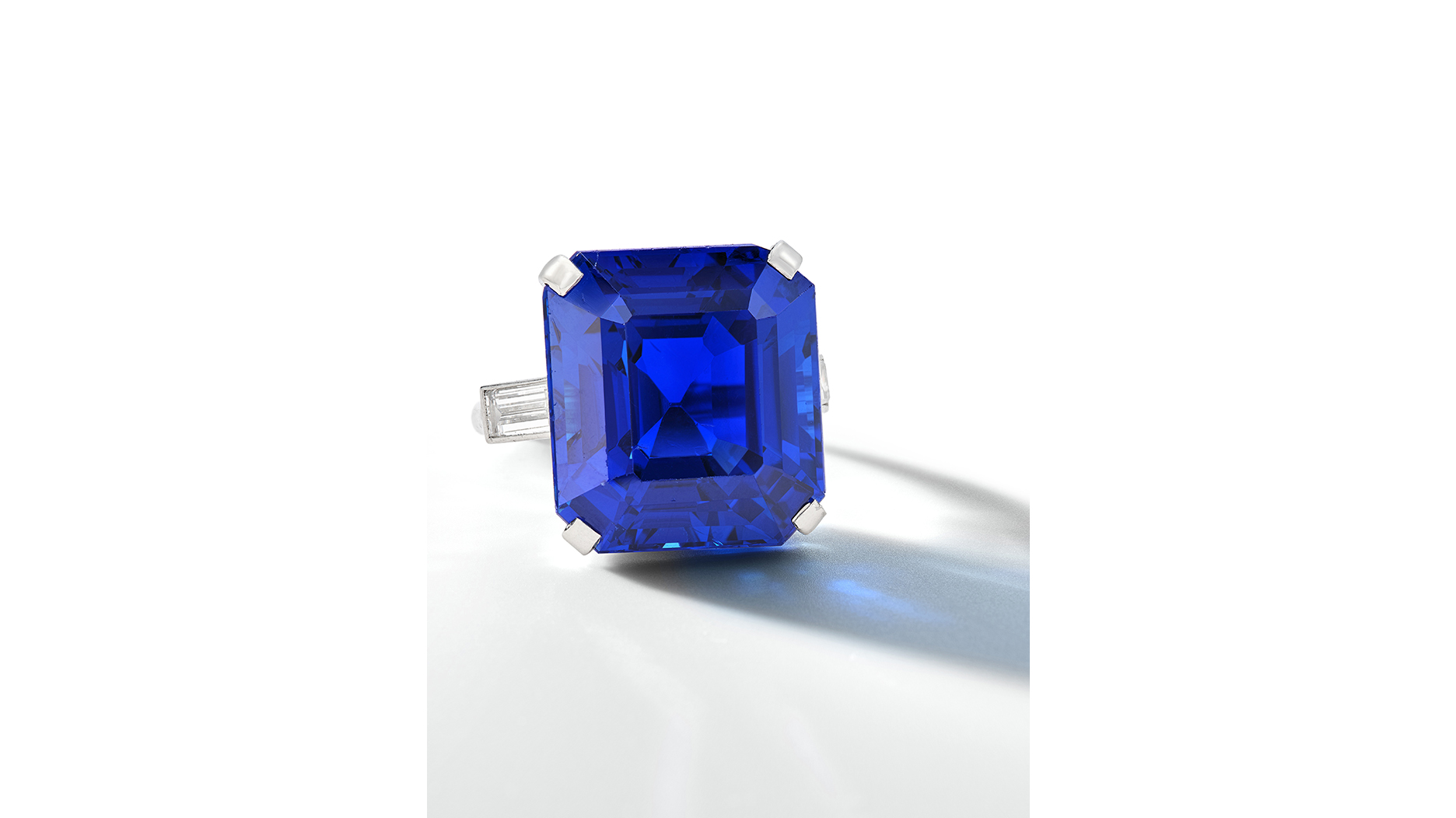 The center stone, flanked by two baguette diamonds, is an emerald-cut Burmese sapphire that is royal blue in color, weighs 33.51 carats and has no indication of heating, according to the auction house.