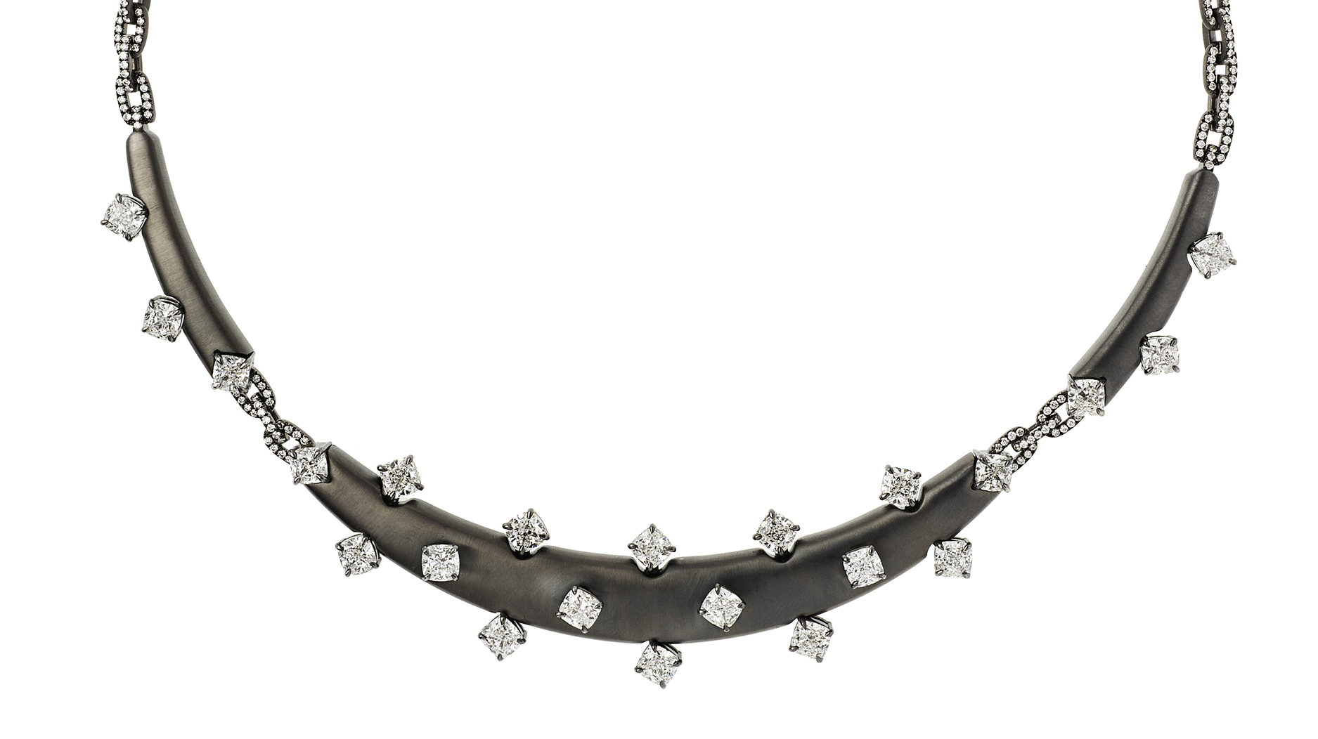On the note of reviving materials that are out of favor, Koulis’ scattered cushion-cut diamonds set on an angle are reminiscent of princess cuts. At Koulis’ hand, the shape feels edgy and compelling.