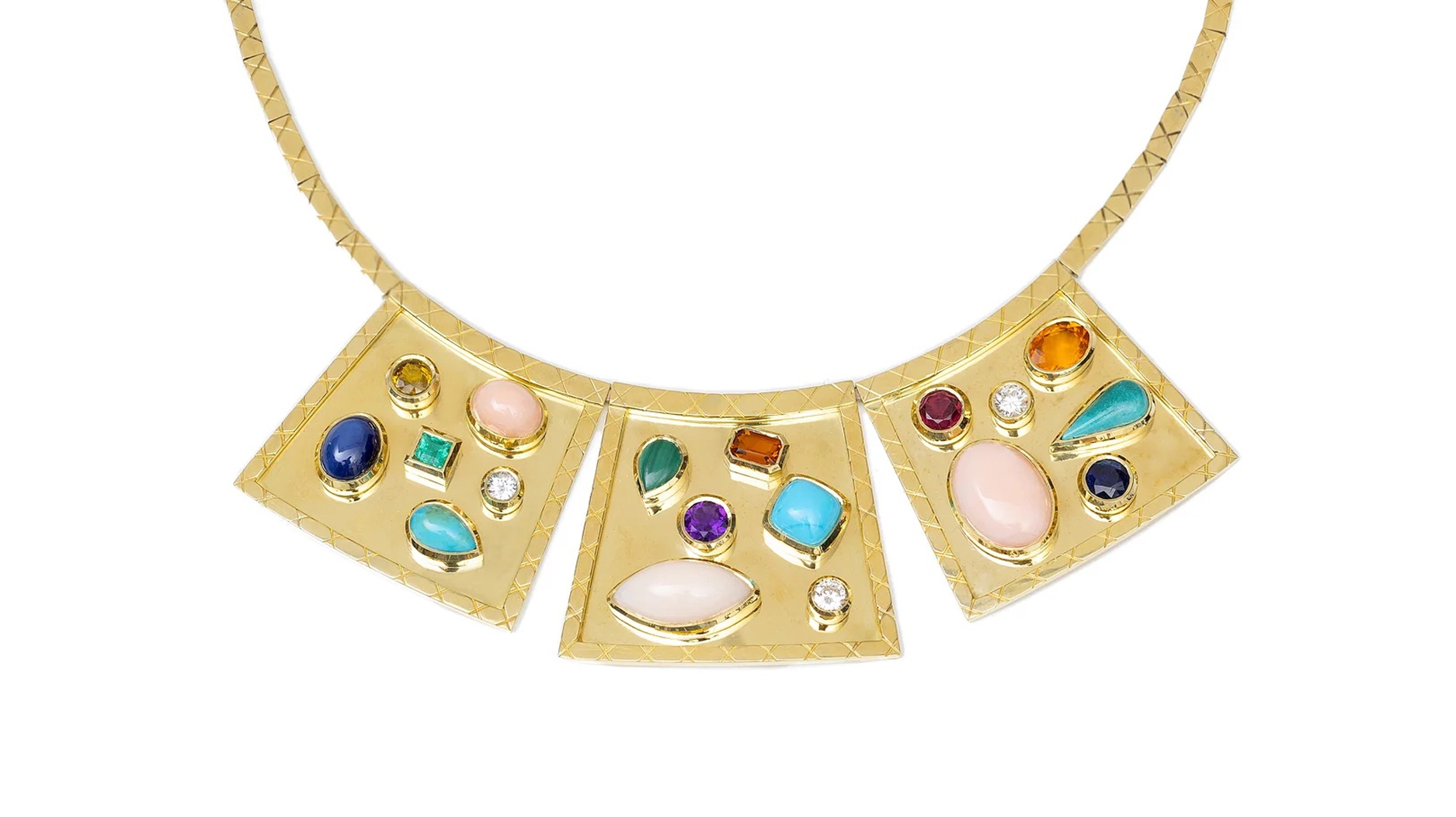 Haven’t seen a bib necklace in a while? Leave it to Jenna Blake to make it covetable again, channeling the style’s 1970s glamour in the new “Eyecon” collection.