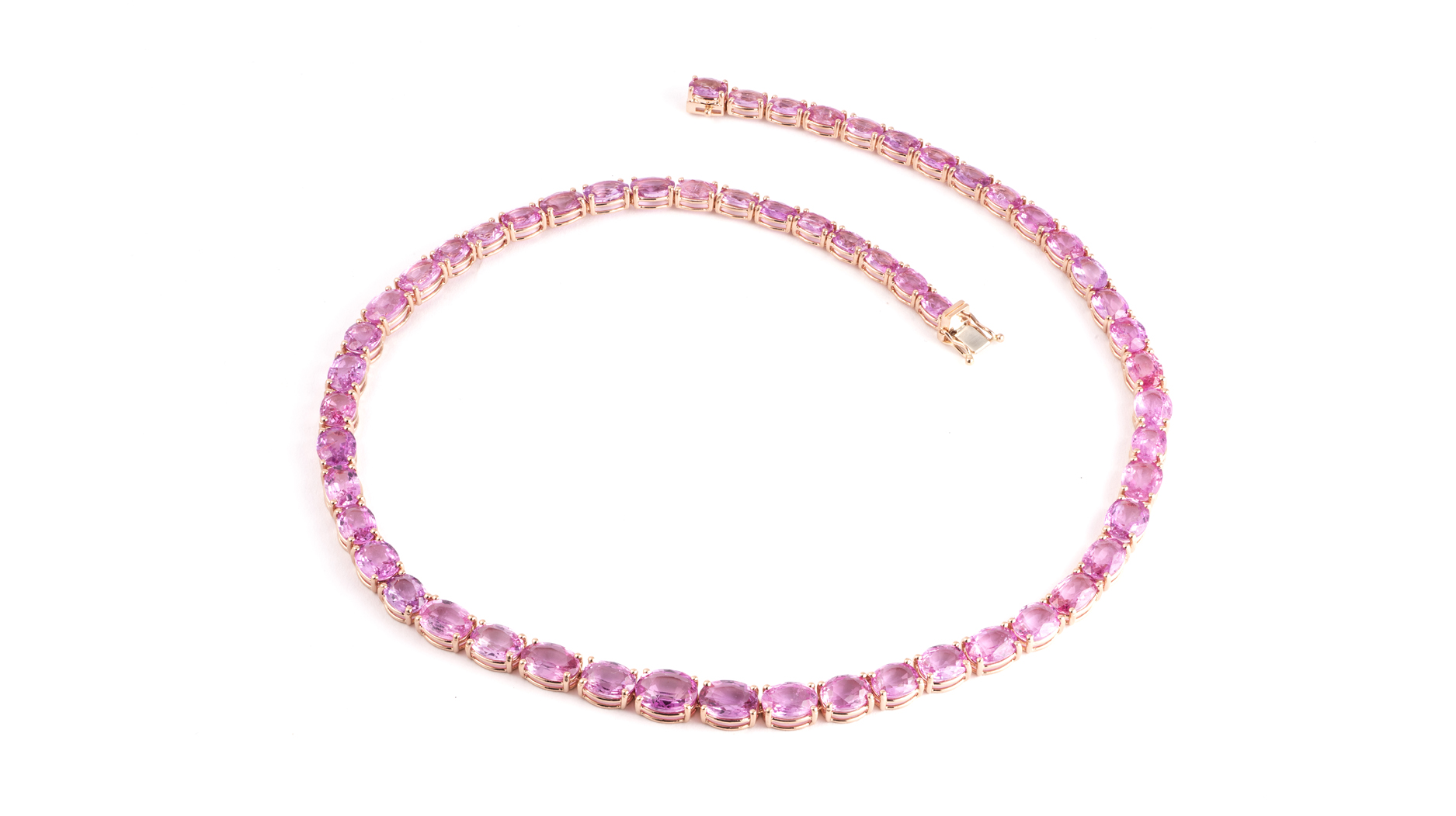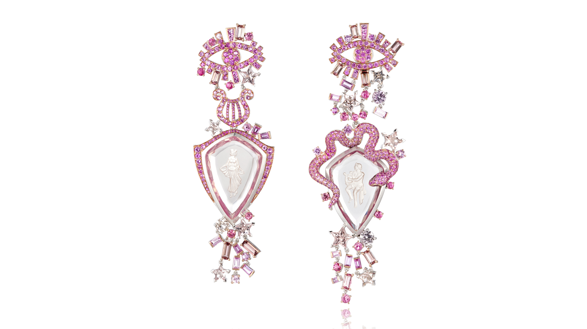 Cleopatra and Mark Anthony, Orpheus and Eurydice, and Tristan and Isolde are some of the legendary couples carved into morganite and framed by a milieu of symbols and design elements dripping in pink sapphires.