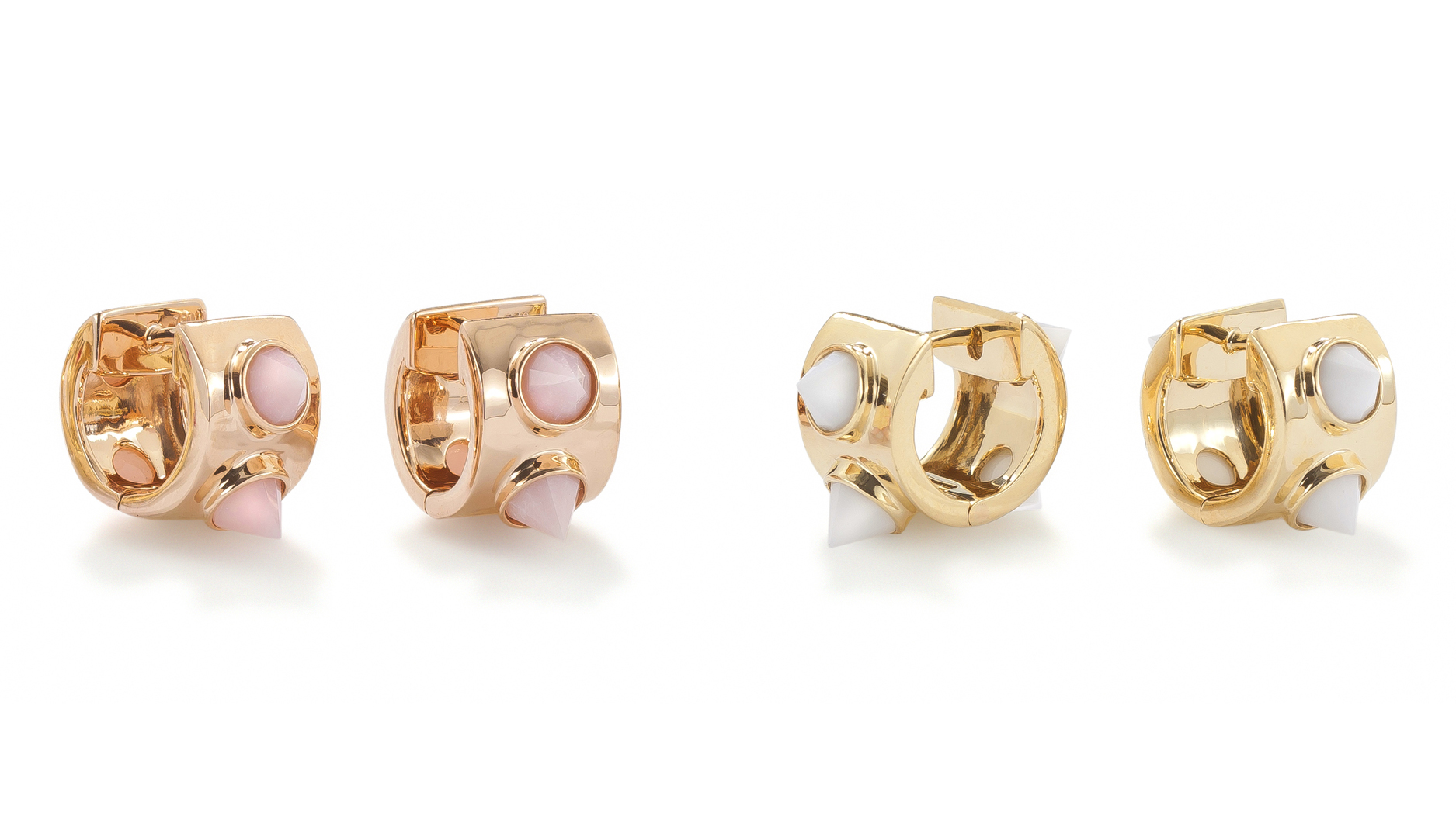 Joining the happy milieu is a style with a bit of an edge—the new “Akida” hoop earring, a wide huggie hoop silhouette perfect for one’s daily uniform, adorned with spiky pink opal, white onyx, turquoise, lapis lazuli, and malachite studs.