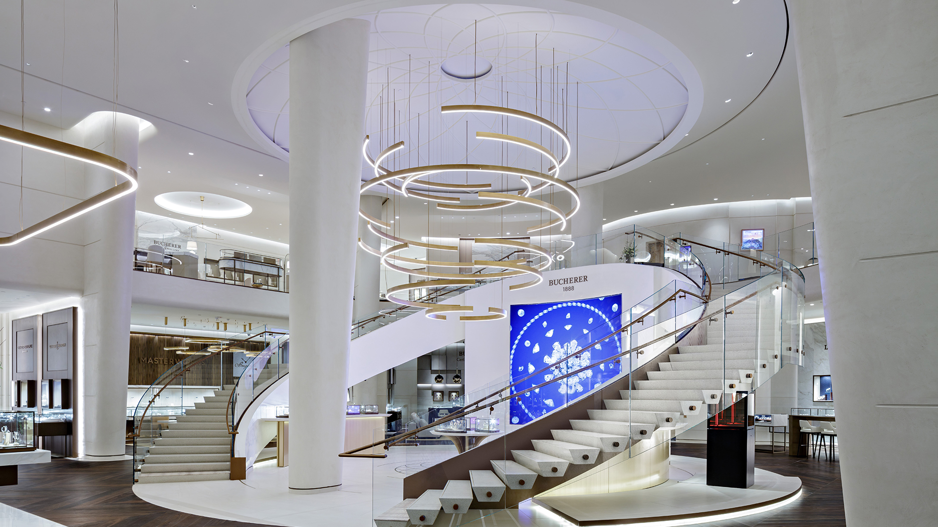 “The entire store is a skillful blend of curves and angles – a geometric dance that entrances the eyes,” said Bucherer.