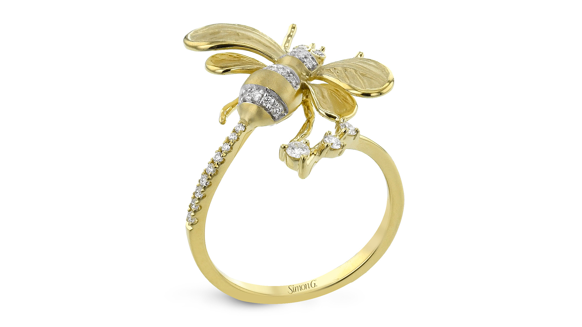 This 18-karat yellow gold bee ring is a cutie. He’s got diamonds where his black stripes and eyes would be, with even more diamond accents down the band.