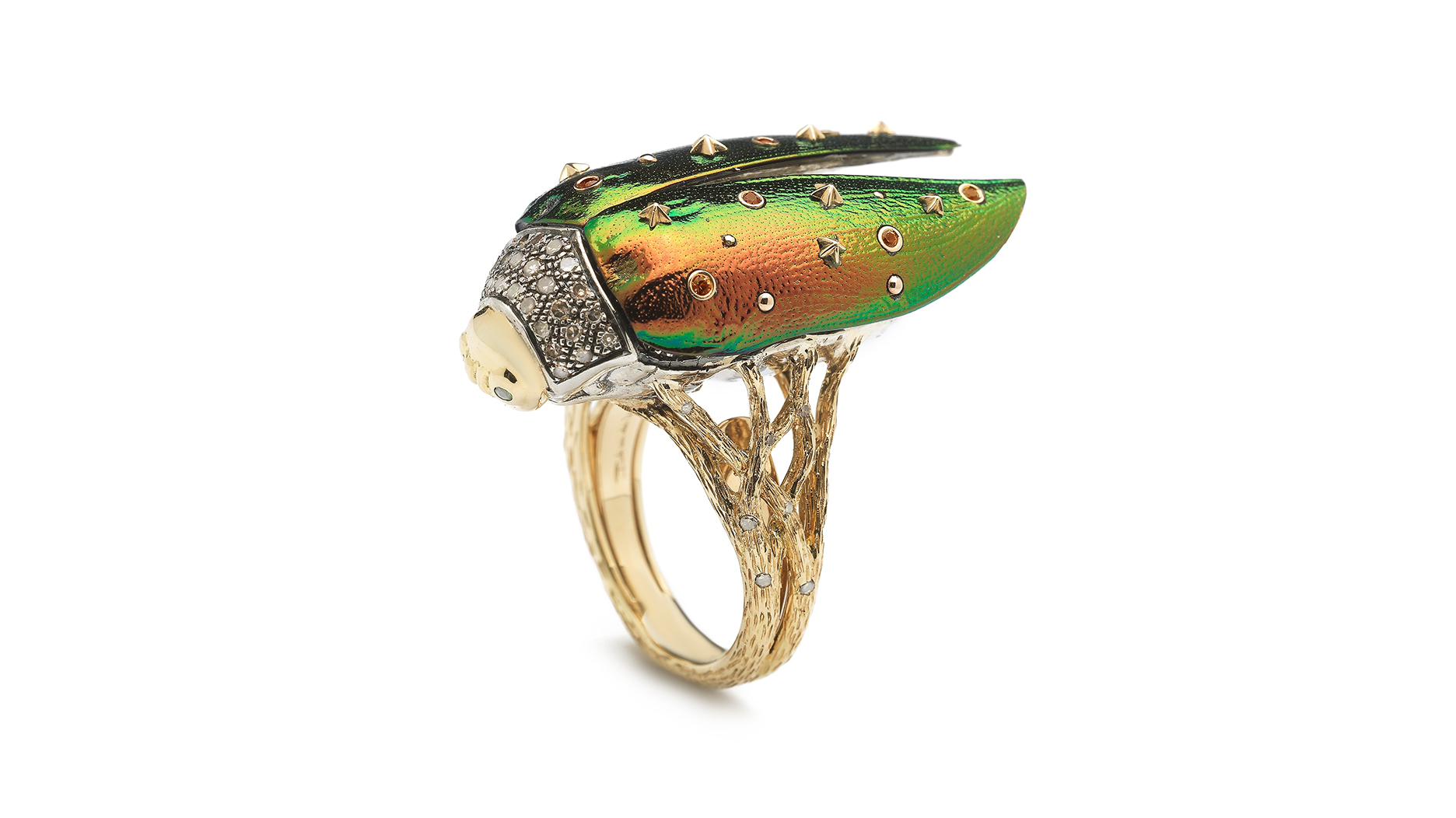 The iridescent color on the wings is a natural marvel, set with orange and yellow sapphires. It has white and brown diamonds by the head and green tsavorite eyes.