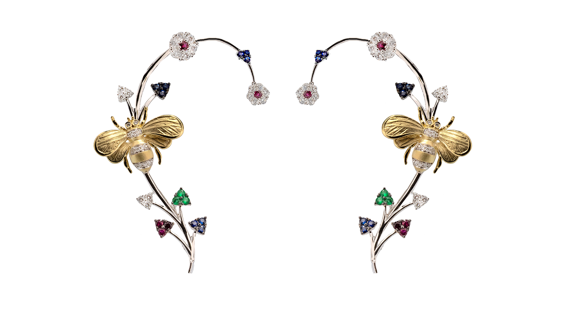 This one-of-a-kind set features our friend the bee again surrounded by flowers made of diamonds, rubies, sapphires and emeralds. It’s also a fun take on the mixed metal looks that were trending at the shows.