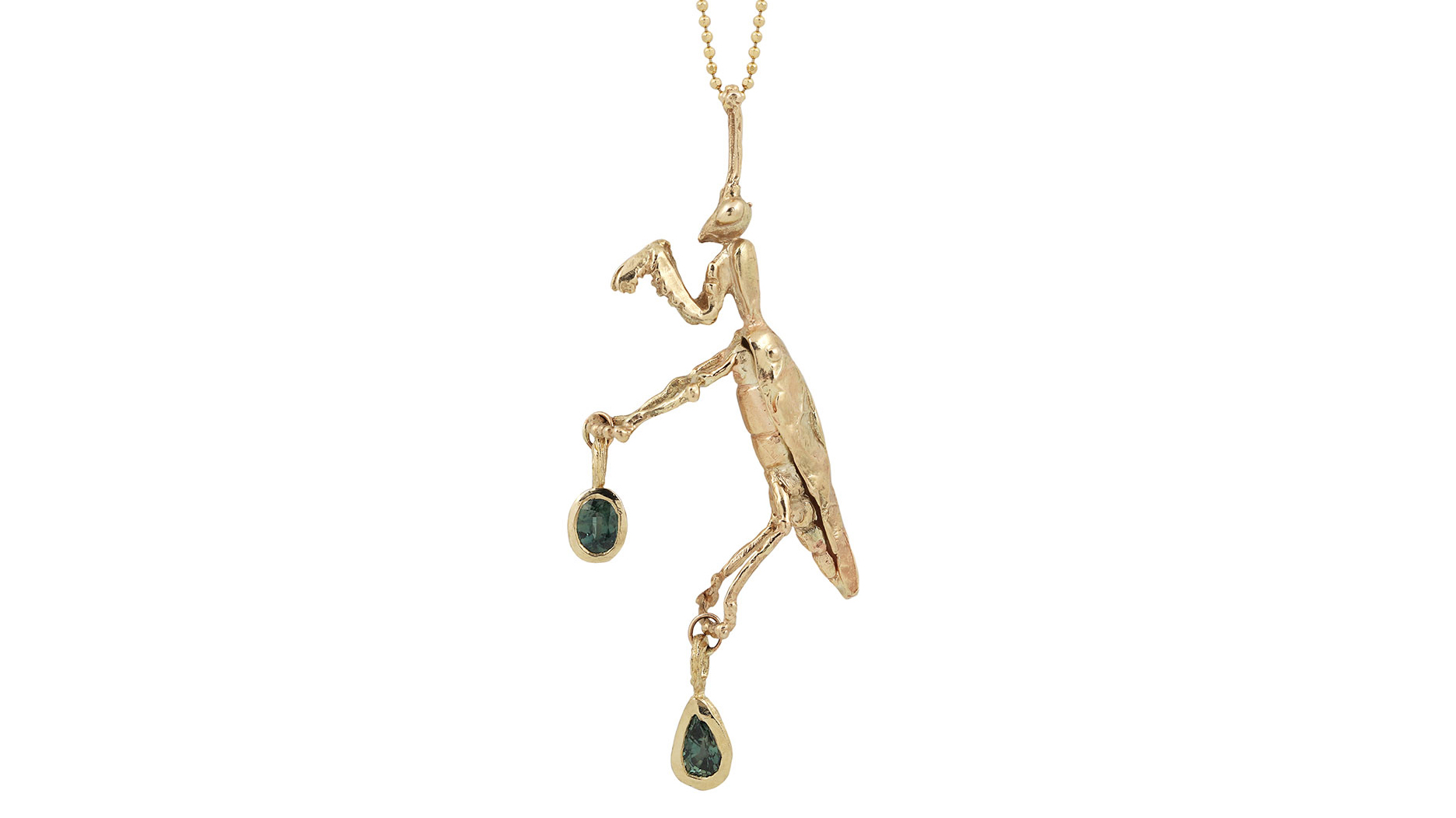 This praying mantis necklace was a jaw-dropper for me. Pavlantos created him by hand-carving each component from wax and then casting it in 14-karat yellow gold. (There is also a silver version.)