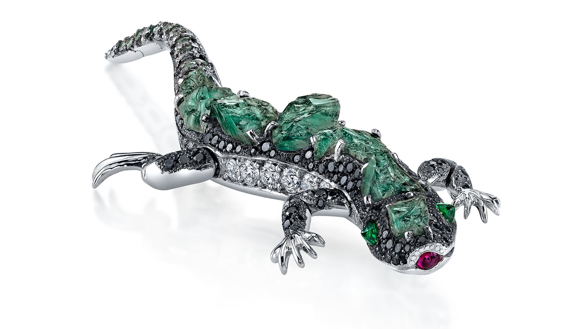 This is Alexis, an 18-karat white gold lizard brooch set with natural color-change rough alexandrite and diamonds. She has green tsavorite eyes and a ruby set culet-up to form a tongue that sticks out, with a movable tail and legs.