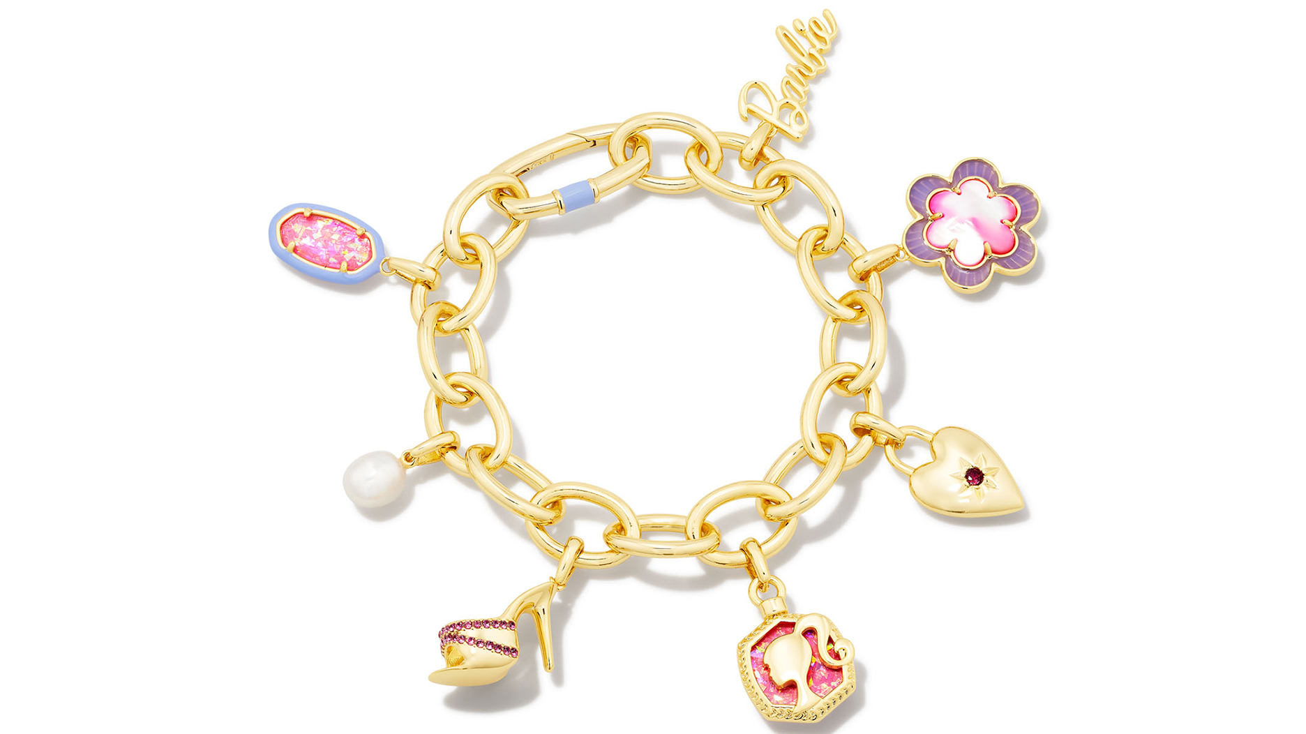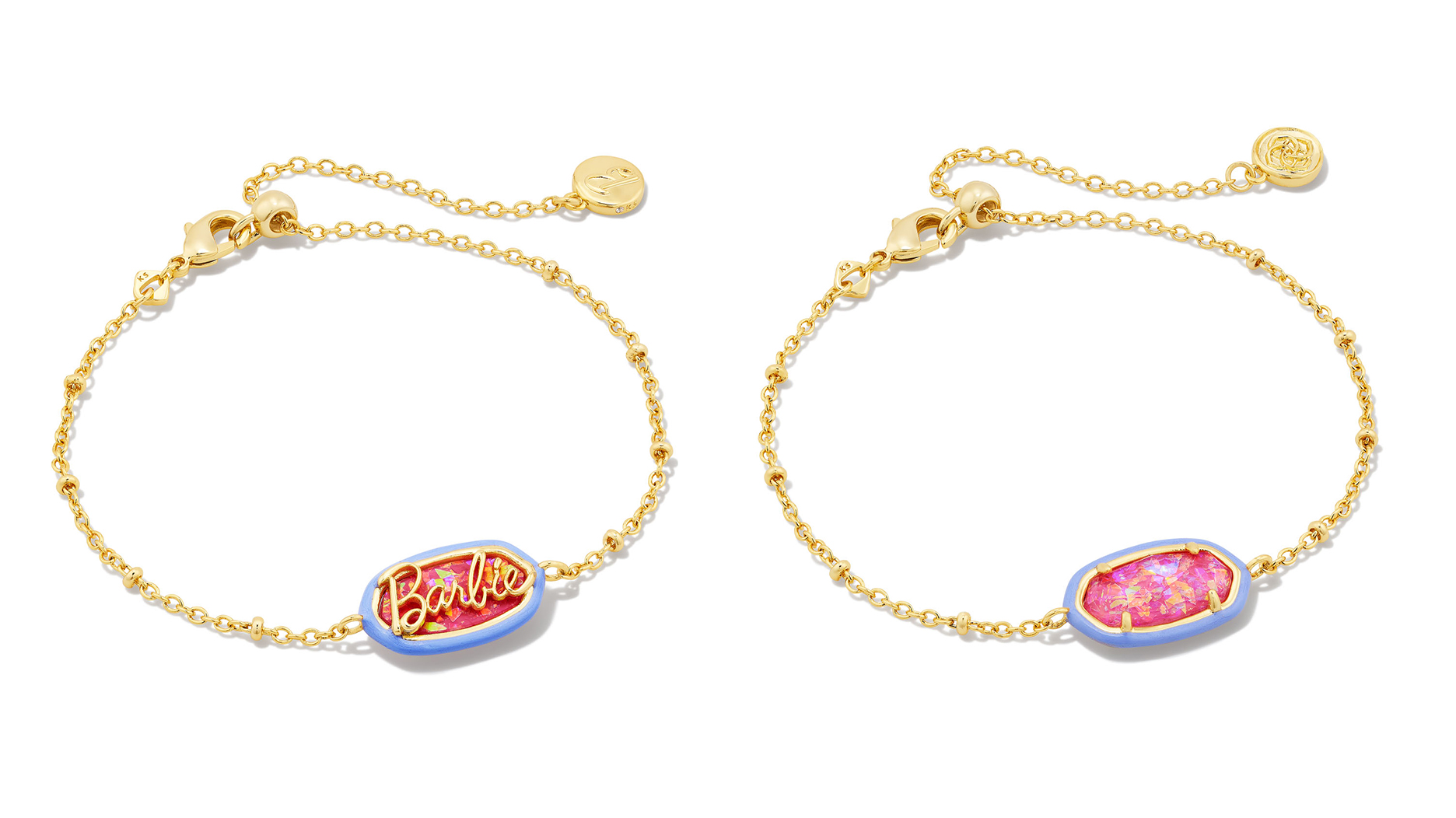 The nine-piece collection includes two bracelets, three necklaces, and four styles of earrings, mixing Kendra Scott’s signature designs with Barbie’s pink palette.