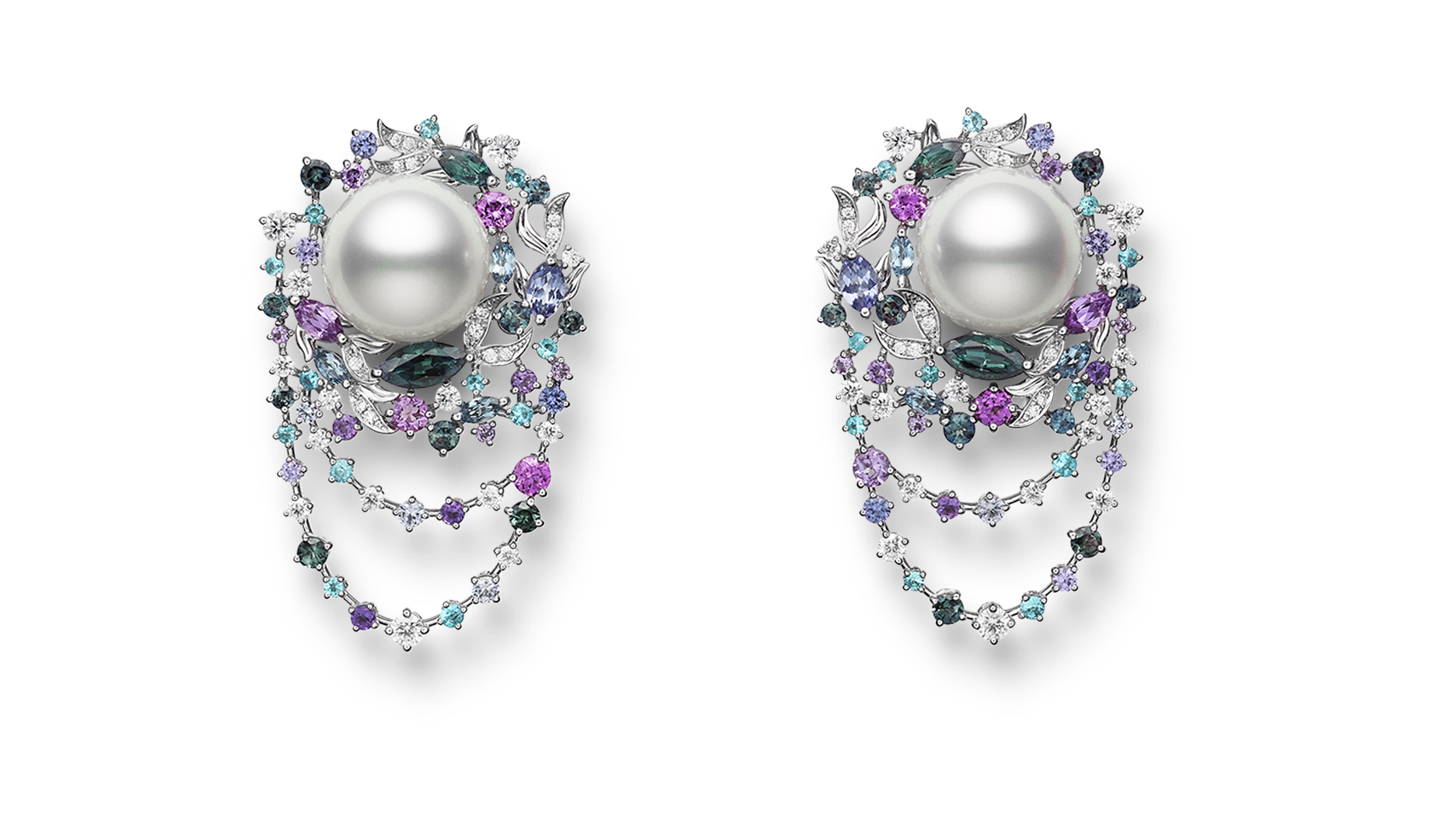 The corresponding ring and earrings feature white South Sea pearls, with the earrings also displaying a variety of cool-toned colored gems. A designer’s note reveals the sapphire and alexandrite were chosen to depict fish of various colors clustered together while gracefully swimming in circles.