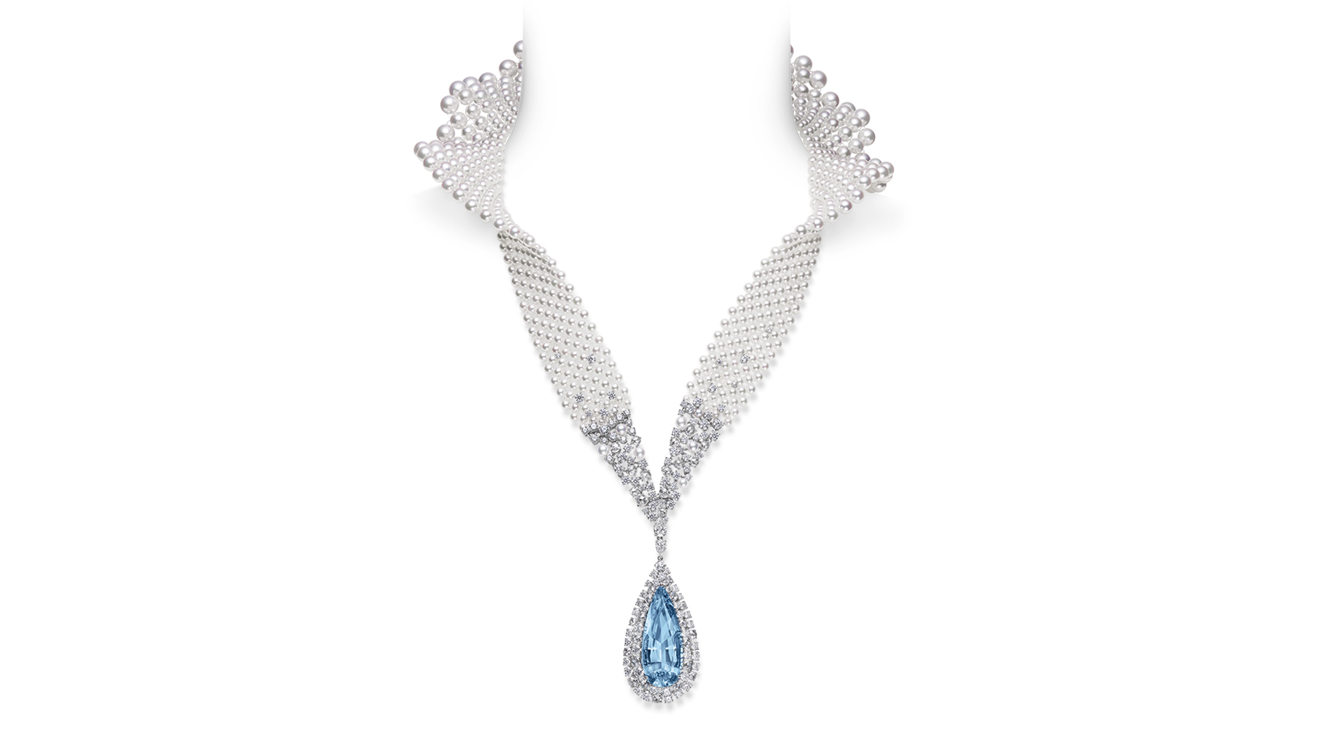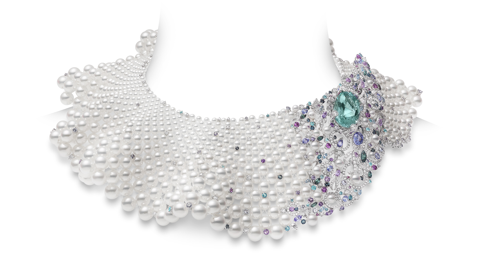 The curves created by schools of fish elegantly navigating the sea inspired a necklace featuring Akoya cultured pearls along with a variety of gemstones including diamond, beryl, tanzanite, tourmaline, amethyst, garnet, sapphire, spinel, alexandrite and aquamarine.